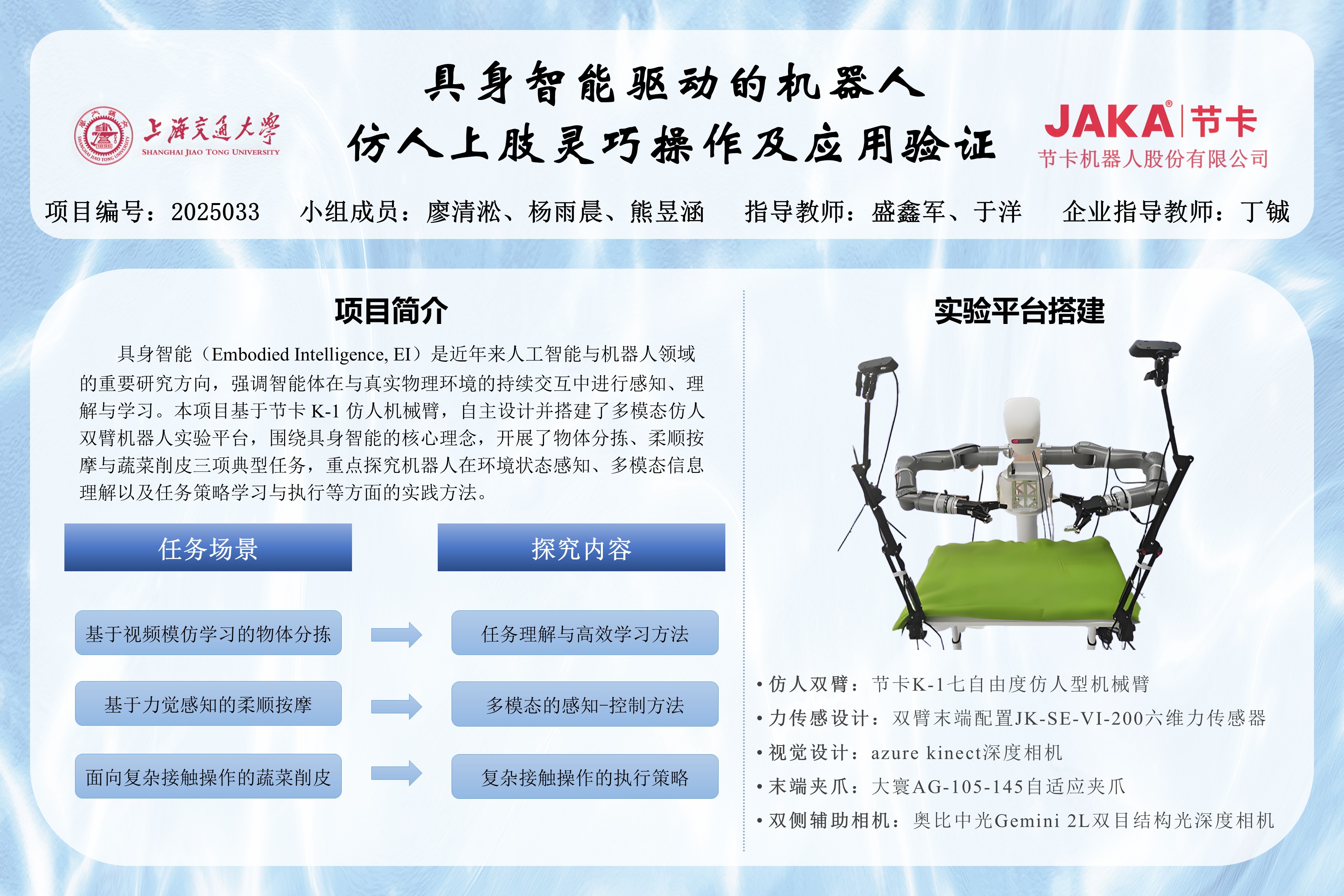 具身智能是近年來人工智能與機器人領域的重要研究方向,強調智能體在與真實物理環(huán)境的持續(xù)交互中進行感知、理解與學習。本項目基于節(jié)卡 K-1 仿人機械臂,自主設計并搭建了多模態(tài)仿人雙臂機器人實驗平臺,圍繞具身智能的核心理念,開展了物體分揀、柔順按摩與蔬菜削皮三項典型任務,重點探究機器人在環(huán)境狀態(tài)感知、多模態(tài)信息理解以及任務策略學習與執(zhí)行等方面的實踐方法。