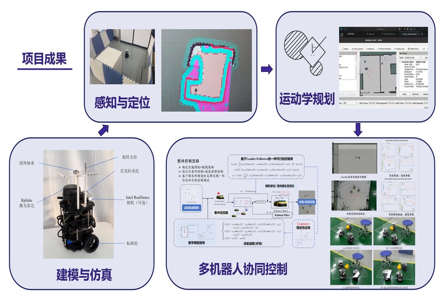 項(xiàng)目首先構(gòu)建雙輪差速驅(qū)動的AGV的動力學(xué)模型,設(shè)計(jì)建模并制造模塊化可旋轉(zhuǎn)式承托結(jié)構(gòu);結(jié)合ROS與Gazebo仿真平臺,開發(fā)相應(yīng)算法并驗(yàn)證,實(shí)現(xiàn)機(jī)器人基于RPLIDAR A2 360°激光掃描測距雷達(dá)的環(huán)境感知與高精度建圖定位、多機(jī)器人互定位、基于柵格地圖的路徑規(guī)劃導(dǎo)航、動態(tài)環(huán)境下多機(jī)器人編隊(duì)控制。最終目標(biāo)為構(gòu)建一套高效、穩(wěn)定、可擴(kuò)展的多機(jī)器人協(xié)同搬運(yùn)系統(tǒng),并在仿真環(huán)境與實(shí)際場景中完成算法測試和搬運(yùn)任務(wù)測試。