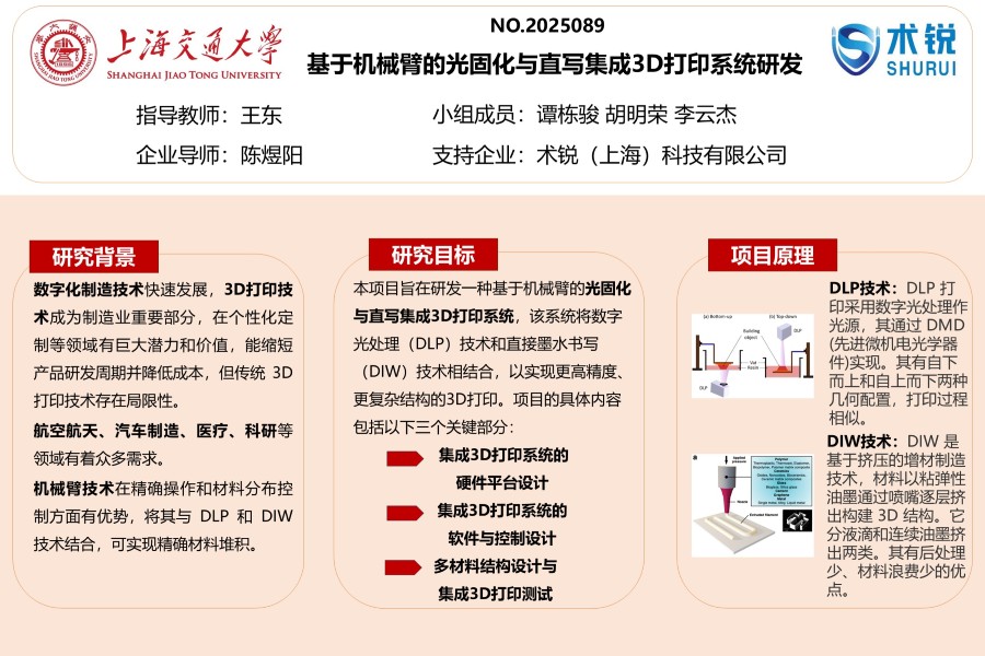 本項目旨在研發(fā)一種基于機械臂的光固化與直寫集成3D打印系統(tǒng),將數(shù)字光處理(DLP)技術和直接墨水書寫(DIW)技術與機械臂技術相結合,以實現(xiàn)更高精度、更復雜結構的多材料3D打印。項目背景源于傳統(tǒng)3D打印技術在材料選擇、打印精度、速度及多材料打印能力上的局限性,而航空航天、醫(yī)療器械等行業(yè)對復雜結構零部件的需求日益增長。項目包括硬件平臺設計、軟件與控制設計、多材料結構設計與集成3D打印測試。硬件設計涵蓋DLP和DIW技術的3D打印系統(tǒng)結構設計與部件加工;軟件與控制設計涉及打印參數(shù)規(guī)劃、路徑軌跡規(guī)劃及控制平臺開發(fā);多材料結構設計與測試關注參數(shù)化設計、打印參數(shù)優(yōu)化及性能測試。