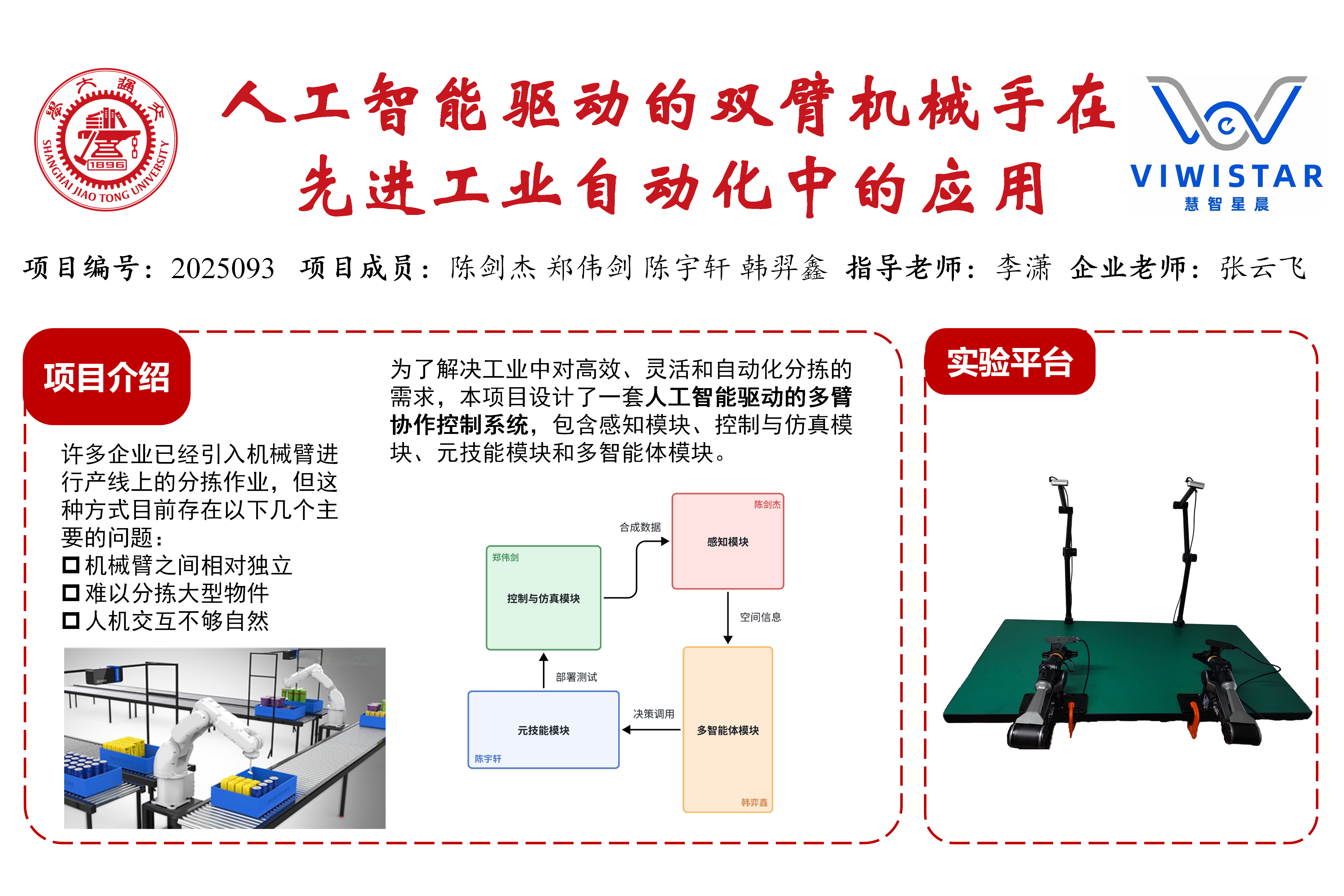 本項目的主題為“人工智能驅(qū)動的雙臂機械手在先進工業(yè)自動化中的應(yīng)用”,聚焦于當(dāng)前工業(yè)分揀場景中面臨的多機械臂協(xié)作難、交互不自然和大型物體操作困難等問題。項目基于人工智能技術(shù),設(shè)計并實現(xiàn)了一套多臂協(xié)作控制系統(tǒng),涵蓋感知、控制仿真、元技能及智能體等多個模塊,旨在提升機械臂在復(fù)雜工業(yè)環(huán)境下的智能化與靈活性。系統(tǒng)依托于視覺感知與語言理解能力,集成控制仿真平臺與實際硬件實驗平臺,結(jié)合虛實融合方案,構(gòu)建完整的從任務(wù)理解、操作規(guī)劃到動作執(zhí)行的閉環(huán)流程。