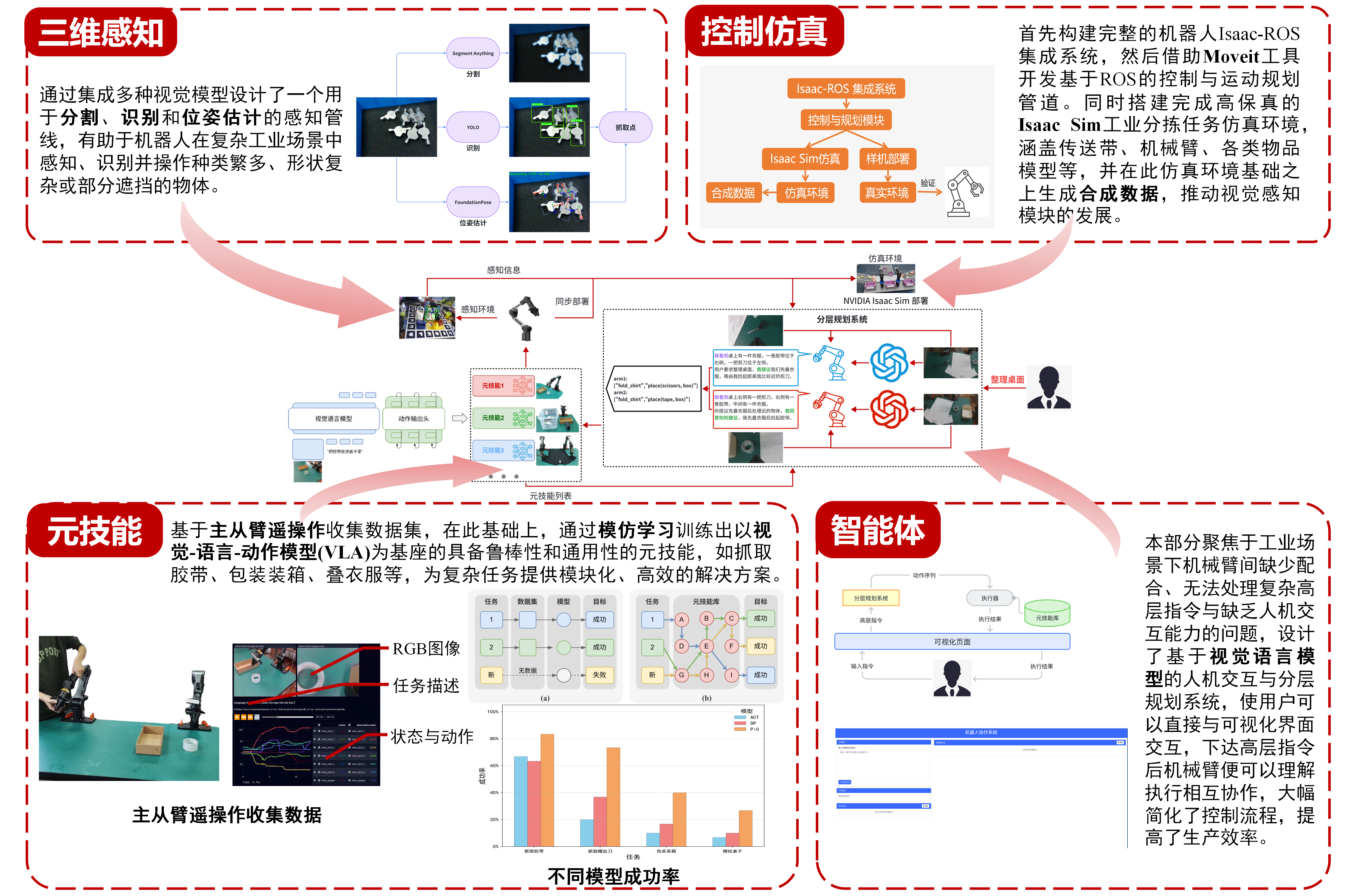 項目旨在構(gòu)建一個智能驅(qū)動的多臂協(xié)作控制系統(tǒng),提升工業(yè)自動化生產(chǎn)中的柔性分揀與復(fù)雜操作能力。為此,系統(tǒng)集成了四大核心模塊:三維感知模塊用于識別和理解復(fù)雜場景下的物體類型和形狀;控制與仿真模塊通過Isaac Sim和ROS進行虛擬任務(wù)訓(xùn)練和路徑規(guī)劃;元技能模塊基于從人類示教中提取的操作動作,訓(xùn)練通用技能模型以支持多類任務(wù);智能體模塊實現(xiàn)人機自然交互,通過語言和視覺指令生成高層策略計劃。最終目標(biāo)是實現(xiàn)高效協(xié)同、多任務(wù)處理和人機融合的自動化系統(tǒng),以適應(yīng)未來智能制造的發(fā)展需求。