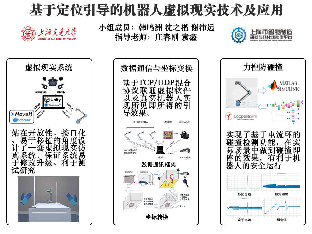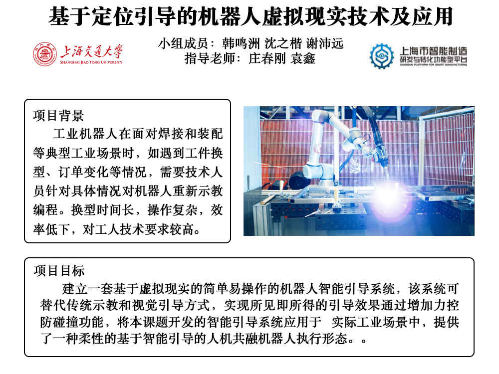 制造業(yè)中,工業(yè)機(jī)器人在面對(duì)焊接、上下料和裝配等典型工業(yè)場(chǎng)景時(shí),常需要技術(shù)人員針對(duì)具體情況對(duì)機(jī)器人進(jìn)行重新示教和編程。這種情況下,換型時(shí)間長(zhǎng),操作復(fù)雜,效率低下,對(duì)工人技術(shù)要求也較高。因此,工業(yè)界需要開發(fā)一種新型的定位與引導(dǎo)方式實(shí)現(xiàn)簡(jiǎn)單、高效、柔性的智能引導(dǎo)操作。基于虛擬現(xiàn)實(shí)的定位引導(dǎo)技術(shù)精度高,成本低,操作簡(jiǎn)單,非常適合作為機(jī)器人定位與引導(dǎo)技術(shù)的新嘗試。本課題中,我們計(jì)劃將定位引導(dǎo)技術(shù)與機(jī)器人力控操作進(jìn)行結(jié)合,開發(fā)簡(jiǎn)單易操作的機(jī)器人智能引導(dǎo)系統(tǒng),同時(shí)開發(fā)基于關(guān)節(jié)電流的機(jī)器人防碰撞監(jiān)控功能,實(shí)現(xiàn)機(jī)器人工作站的智能引導(dǎo),點(diǎn)位定位,軌跡復(fù)現(xiàn)與簡(jiǎn)單裝配動(dòng)作實(shí)現(xiàn)。