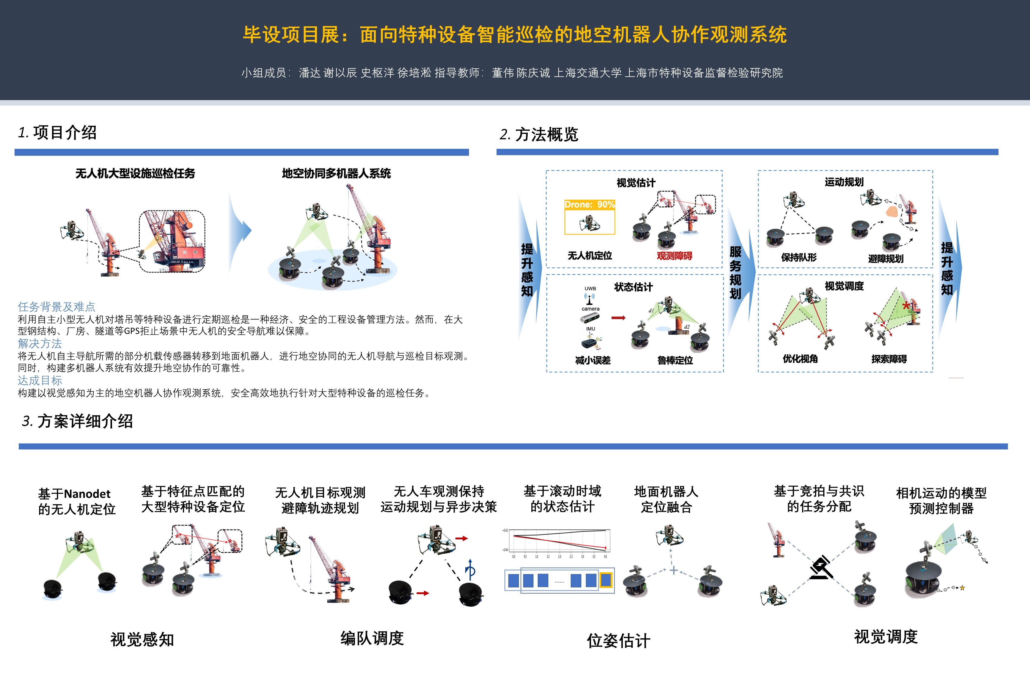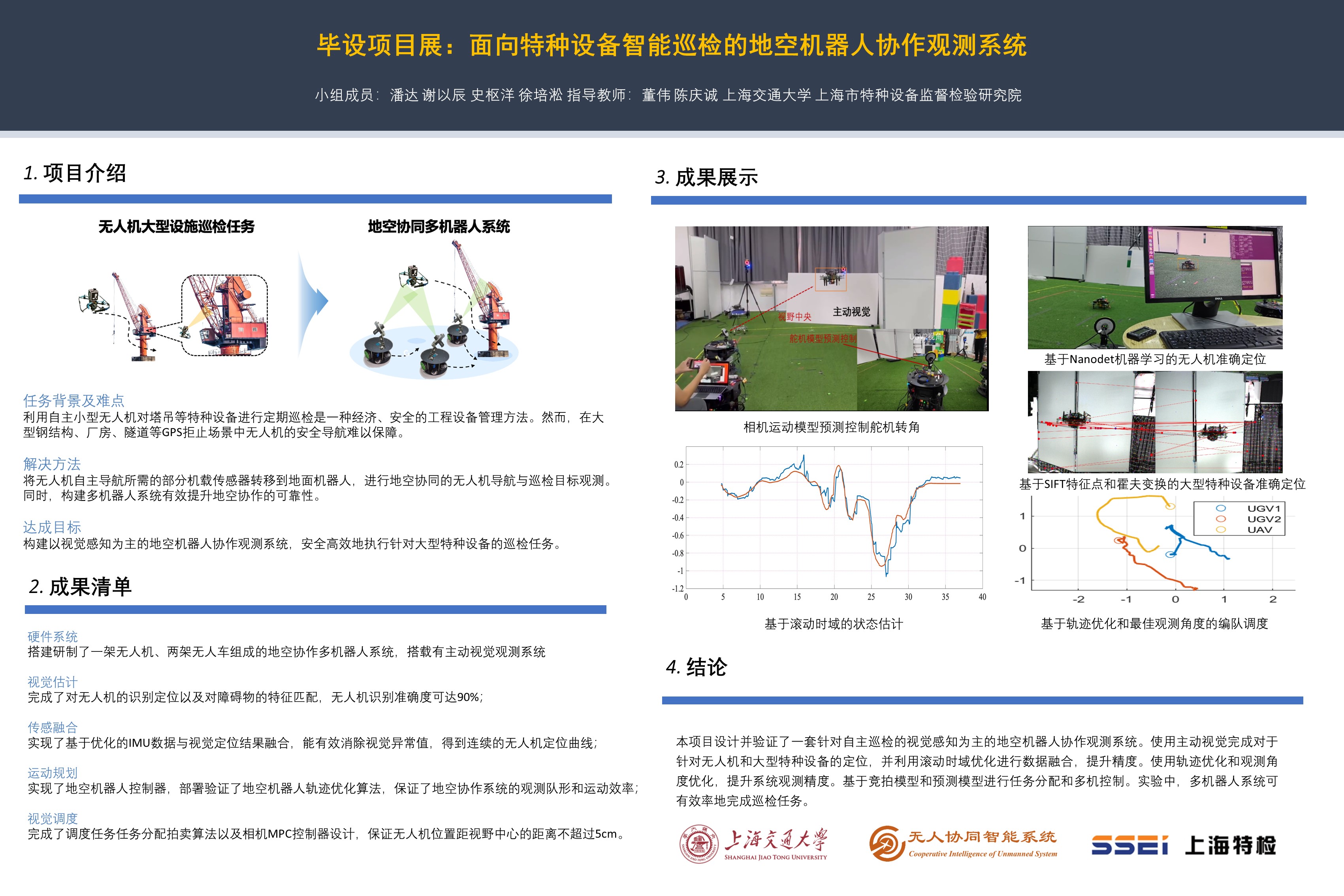 搭建研制了一架無人機、兩架無人車組成的地空協(xié)作多機器人系統(tǒng);并且完成了視覺估計、傳感融合、運動規(guī)劃、視覺調(diào)度軟硬件設(shè)計。