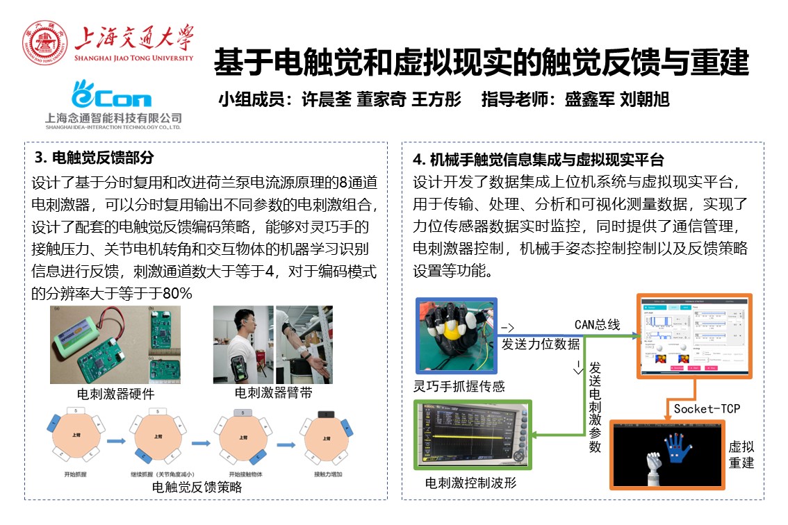 本項目旨在實現(xiàn)以下目標(biāo):拓展機(jī)械靈巧手的前端力位感知能力,實現(xiàn)對抓握過程中的接觸力、關(guān)節(jié)角度以及交互物體信息進(jìn)行感知;電觸覺反饋模塊能夠?qū)τ陟`巧手的前端傳感器數(shù)據(jù)以及用戶的控制意圖,通過適當(dāng)?shù)碾娪|覺反饋編碼策略實現(xiàn)觸覺信息的反饋,傳遞人機(jī)交互過程中的力觸覺和本體感;設(shè)計用于與靈巧手交互的虛擬現(xiàn)實平臺和上位機(jī)模塊,虛擬現(xiàn)實平臺可以實現(xiàn)對靈巧手的抓握過程進(jìn)行重建,上位機(jī)界面可以顯示靈巧手觸覺信息和電觸覺反饋策略控制。