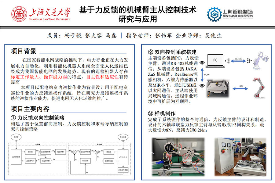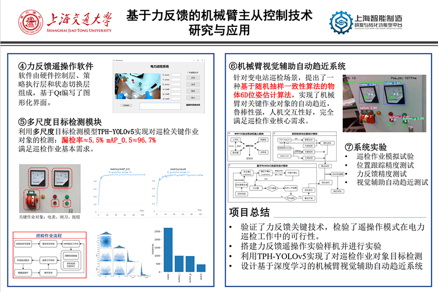 初步完成變電站力反饋遙操作巡檢機器人系統(tǒng)的設(shè)計與制作,其中包括:搭建了同構(gòu)串聯(lián)型六自由度遙操作平臺;制定并實現(xiàn)了主從雙向控制控制策略;編寫了帶人機交互界面的遙操作軟件;完成了遙操作平臺典型巡檢作業(yè)任務試驗;設(shè)計了基于深度學習的目標檢測系統(tǒng)與基于深度相機的機械臂自動趨近系統(tǒng),實現(xiàn)了對變電站典型作業(yè)對象的目標檢測以及機械臂末端對目標作業(yè)對象的自動趨近;設(shè)計了AMR巡檢控制系統(tǒng),實現(xiàn)了AMR對指定巡檢點位的自動趨近。