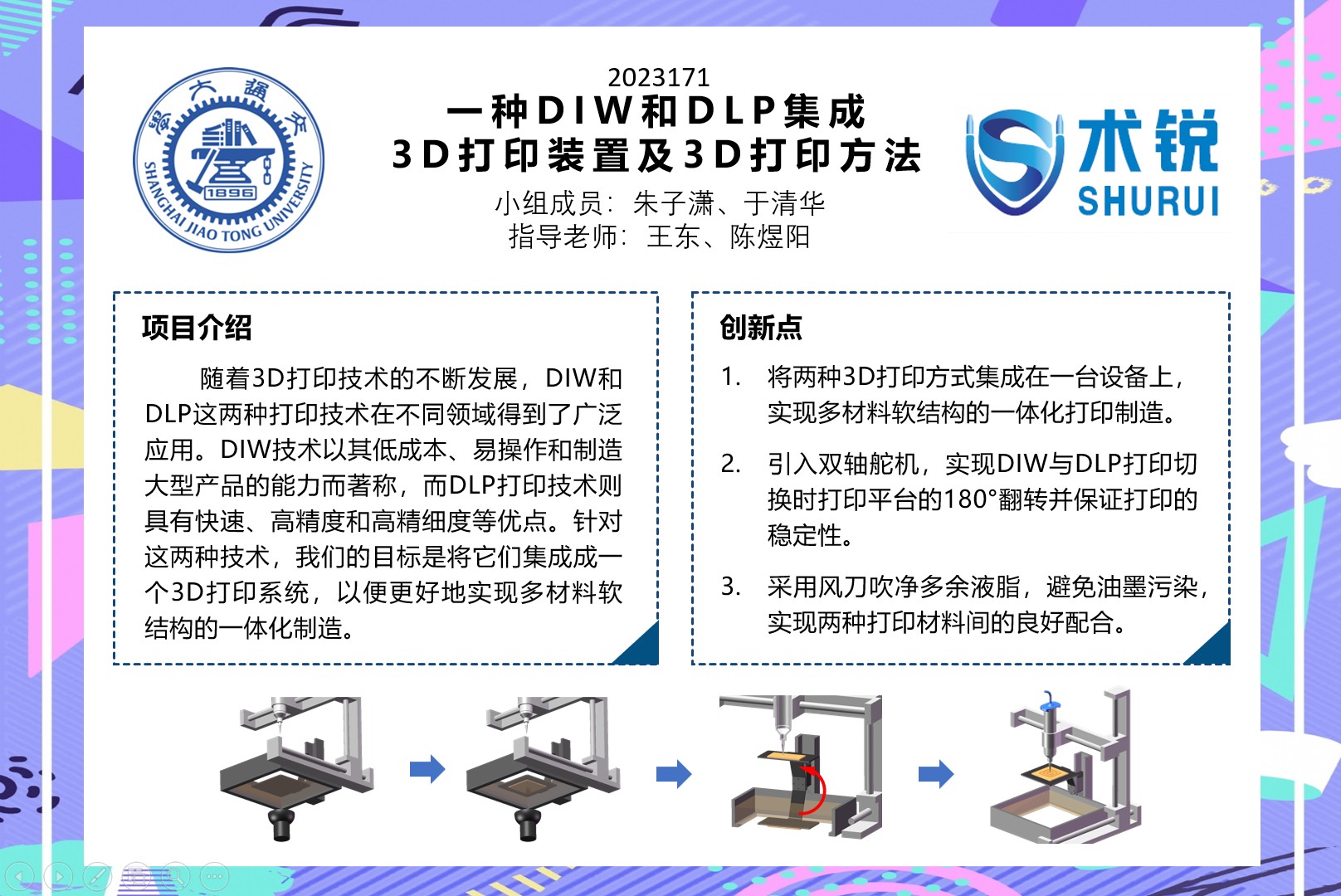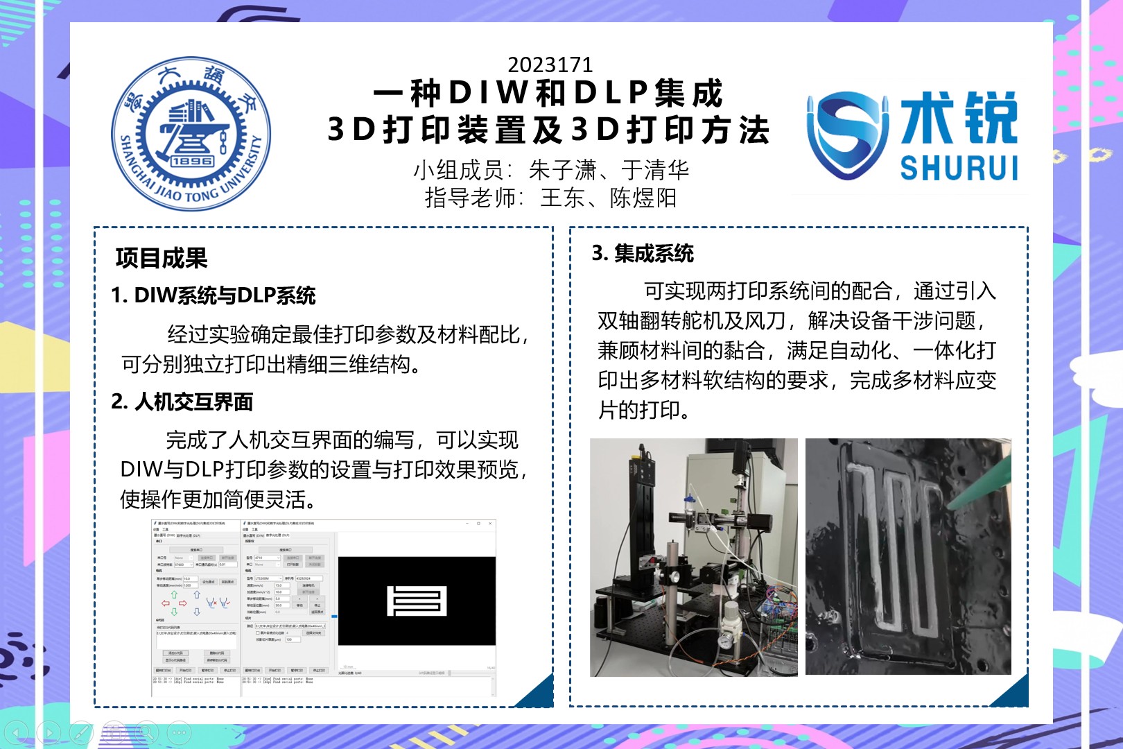 對于DLP方向,我們需要考慮打印平臺的優(yōu)化設計和打印材料的選擇,保證打印的精度和質量。對于DIW方向,我們需要設計一個完整的DIW打印系統(tǒng),實現(xiàn)三軸移動的控制,并編寫解析G代碼的程序。為了將DIW和DLP集成為一個3D打印系統(tǒng),我們需要進行結構設計、加工和硬件平臺的搭建,充分考慮兩系統(tǒng)間的位置與材料配合。另外,我們需要編寫DIW和DLP集成3D打印系統(tǒng)的一體化控制程序,制作出一款簡潔明了的交互程序,方便操作人員進行參數(shù)調試,并能夠實現(xiàn)自動化打印。