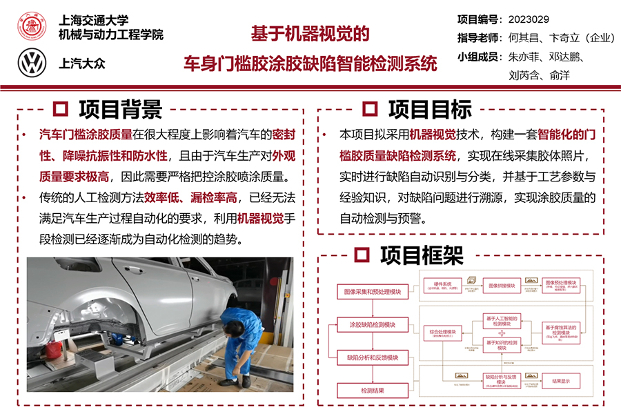 本項(xiàng)目研究對(duì)象主要為汽車門檻膠,目的是對(duì)汽車門檻涂膠檢測(cè)環(huán)節(jié)搭建一套完整的智能化的門檻膠質(zhì)量缺陷檢測(cè)系統(tǒng),解決實(shí)際生產(chǎn)中人工檢測(cè)涂膠質(zhì)量檢測(cè)效率低的問題。通過結(jié)合傳統(tǒng)視覺算法與人工智能方法,使用機(jī)器視覺技術(shù)對(duì)各類不同的涂膠缺陷進(jìn)行分類與檢測(cè),并對(duì)涂膠過程中的各項(xiàng)質(zhì)量檢測(cè)指標(biāo)進(jìn)行檢測(cè)以完成缺陷分析與反饋,達(dá)成檢測(cè)系統(tǒng)的閉環(huán)。
