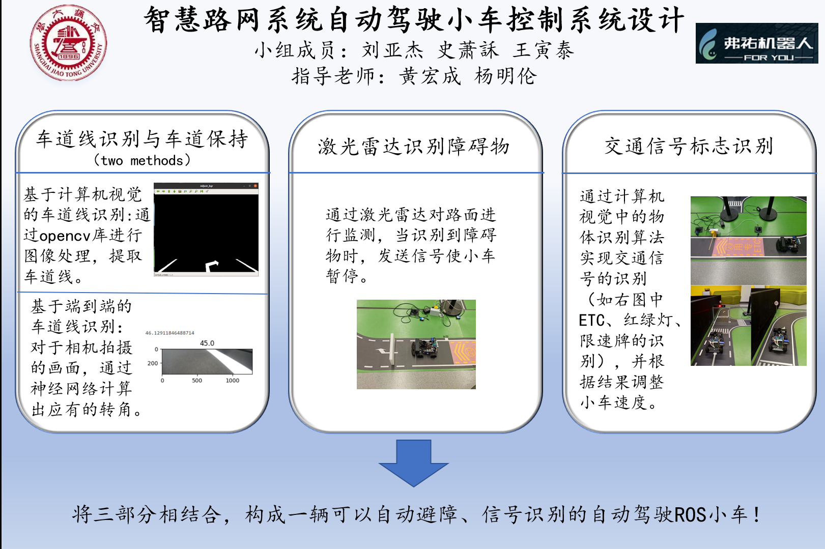 最終小車能夠完成以下任務(wù):一,通過視覺識(shí)別獲取道路車道線的位置和走向,不斷調(diào)整前進(jìn)方向,小車能夠在車道線內(nèi)行駛;二,通過計(jì)算機(jī)視覺中的物體識(shí)別算法實(shí)現(xiàn)道路中交通信號(hào)的識(shí)別,并根據(jù)識(shí)別到的信號(hào)調(diào)整小車速度,例如識(shí)別到紅燈停下來,識(shí)別到ETC通道加速通過;三,通過激光雷達(dá)SLAM技術(shù)實(shí)現(xiàn)跑道周圍環(huán)境的建圖,顯示小車當(dāng)前位置,并能夠完成不同位置之間的路徑規(guī)劃,同時(shí)檢測(cè)道路中的障礙物,當(dāng)識(shí)別到障礙物時(shí)使小車停止運(yùn)動(dòng)。