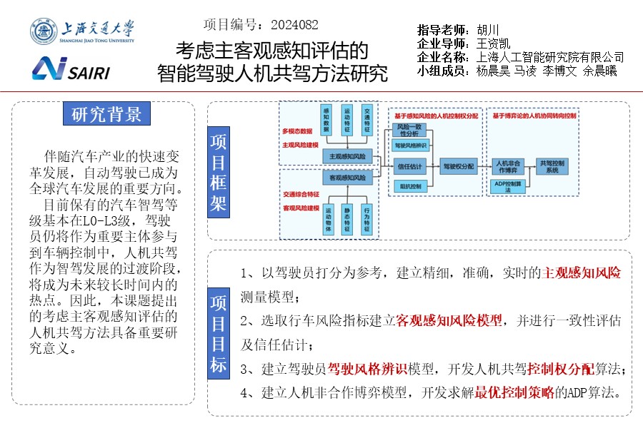 伴隨汽車產(chǎn)業(yè)的快速變革發(fā)展,自動(dòng)駕駛已成為全球汽車發(fā)展的重要方向。目前保有的汽車智駕等級(jí)基本在L0-L3級(jí),駕駛員仍將作為重要主體參與到車輛控制中,人機(jī)共駕作為智駕發(fā)展的過渡階段,將成為未來較長時(shí)間內(nèi)的熱點(diǎn)。據(jù)此本項(xiàng)目設(shè)計(jì)了一套考慮主客觀感知評(píng)估的人機(jī)共駕方法:構(gòu)建了一個(gè)考慮主客觀風(fēng)險(xiǎn)的信任估計(jì)模型,并在此模型的基礎(chǔ)上設(shè)計(jì)人機(jī)控制權(quán)分配策略,最終基于博弈思想實(shí)現(xiàn)控制策略,形成一套完整的基于主客觀風(fēng)險(xiǎn)的人機(jī)共駕協(xié)同控制方法,提升自動(dòng)駕駛系統(tǒng)的安全性、可靠性。