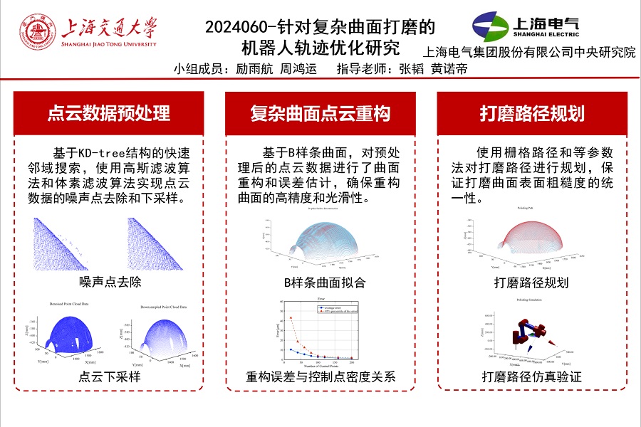 復(fù)雜曲面零部件被廣泛應(yīng)用在汽車、航空航天、船舶等諸多領(lǐng)域中,這類零件通常對表面質(zhì)量要求較高,表面存在的毛刺、焊縫殘高、粗糙度不達(dá)標(biāo)等問題,極易影響零件的空氣動力學(xué)性能和服役表現(xiàn),通常需要高精度打磨來保證其表面質(zhì)量。然而其中存在機(jī)器人自身精度不足、點(diǎn)云數(shù)據(jù)處理復(fù)雜、打磨軌跡生成困難等一系列難題。對此,本項目基于六軸工業(yè)機(jī)器人及點(diǎn)云數(shù)據(jù),開展機(jī)器人誤差識別、復(fù)雜曲面打磨軌跡優(yōu)化等研究,實現(xiàn)在無模型場景下對復(fù)雜曲面的高精度打磨路徑規(guī)劃。
