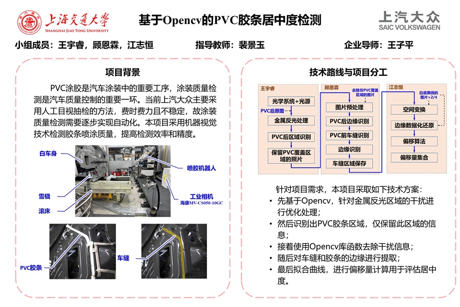 PVC涂料被廣泛用于車身板金的切邊及鈑金縫處,起到防水密封、防止鈑金切邊銹蝕的作用。上汽大眾采用自動化設(shè)備噴涂PVC膠條,噴涂過程中機(jī)器人發(fā)生偏移,車身晃動,PVC材料溫度、壓力、黏度波動,機(jī)器人槍嘴堵塞等因素,都可能導(dǎo)致膠條未能居中焊縫。當(dāng)前上汽大眾主要采用人工目視抽檢的方法,此方法費(fèi)時費(fèi)力。本課題采用機(jī)器視覺技術(shù),自動測量PVC膠條中心骨架與車縫偏移量,以解決膠條噴涂質(zhì)量檢測問題。