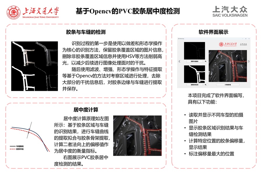 本項(xiàng)目完成了基于OpenCV的膠條居中度檢測與計算系統(tǒng)。項(xiàng)目采用基于HSV的去高光算法,能夠有效地排除金屬表面高光對膠條識別的干擾,項(xiàng)目采用基于SSIM的膠條識別算法,可準(zhǔn)確識別出多種車型上、灰白兩色的膠條區(qū)域;采用濾波、增強(qiáng)、形態(tài)學(xué)操作等方法對膠條覆蓋區(qū)域的車身圖像進(jìn)行處理,通過邊緣檢測算法提取車縫位置信息;對車縫曲線進(jìn)行提取與擬合,同時提取膠條中心骨架,二者比較計算得到膠條偏移量,并進(jìn)行了實(shí)際距離單位轉(zhuǎn)化與誤差討論。