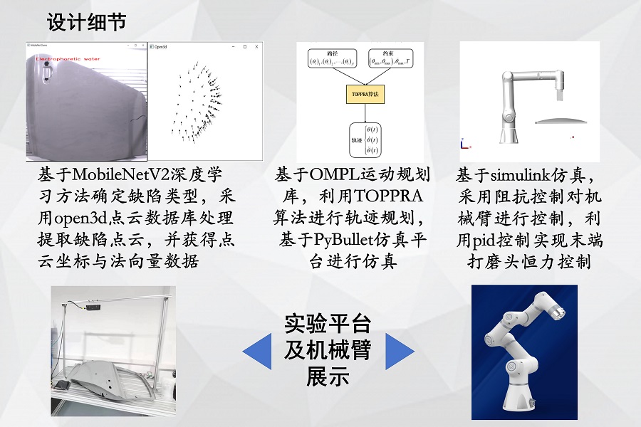 完成視覺檢測和拋光實驗平臺的搭建。首先是搭建基于2.5D的視覺檢測平臺和實現(xiàn)缺陷檢測的功能,通過缺陷檢測的機(jī)器學(xué)習(xí)方法,得到相關(guān)缺陷數(shù)據(jù)坐標(biāo)。然后是機(jī)器人拋光路徑優(yōu)化,機(jī)器人根據(jù)視覺系統(tǒng)檢測的缺陷位置和類型,優(yōu)化拋光過程的軌跡,確保缺陷被去除,同時考慮系統(tǒng)避障功能。最后是拋光實驗平臺搭建,包括力控機(jī)器人、前端拋光工具,能夠進(jìn)行拋光實驗驗證,從而實現(xiàn)機(jī)器人曲面恒力跟蹤方法及拋光驗證,對拋光任務(wù)進(jìn)行規(guī)劃與優(yōu)化,增強(qiáng)任務(wù)的魯棒性。