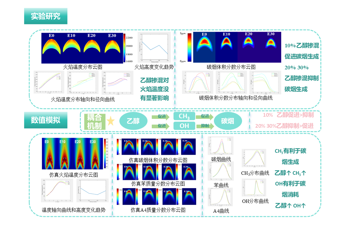 研究發(fā)現(xiàn),火焰高度主要受氧化劑濃度和碳質(zhì)量流量控制,乙醇摻混對火焰高度沒有顯著影響;乙醇摻混會降低火焰中心區(qū)域燃料碳?xì)浔取⑻嵘踉訚舛龋鰪?qiáng)氧化反應(yīng)強(qiáng)度,使火焰軸向溫度升高;碳煙呈翼型分布于火焰尖端區(qū)域,中軸線區(qū)域因空燃比低成為主要富集區(qū)。實(shí)驗(yàn)與仿真結(jié)果表明,碳煙體積分?jǐn)?shù)大小總體表現(xiàn)出E10>E0>E20>E30。乙醇摻混對碳煙生成呈現(xiàn)雙重耦合效應(yīng):一方面產(chǎn)生更多CH3加速多環(huán)芳烴形成促進(jìn)碳煙生成,另一方面產(chǎn)生更多OH強(qiáng)化碳煙氧化消耗。低摻混比例(E10)以生成促進(jìn)作用為主導(dǎo),高比例(E20/E30)則轉(zhuǎn)化為氧化消耗主導(dǎo)。