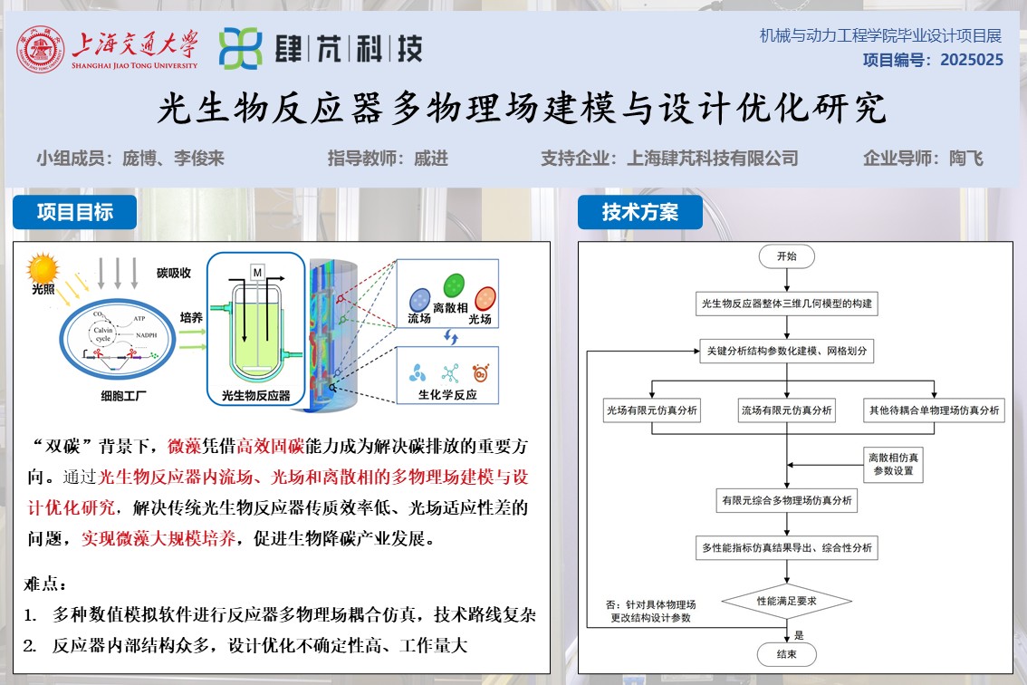 “雙碳”背景下,微藻憑借高效固碳能力成為解決碳排放的重要方向,但傳統(tǒng)光生物反應器因傳質(zhì)效率低、光場適應性差等問題,難以實現(xiàn)微藻大規(guī)模培養(yǎng),限制了生物降碳產(chǎn)業(yè)發(fā)展。本項目圍繞光生物反應器多物理場耦合建模仿真,建立數(shù)字孿生模型,得到反應器內(nèi)流場、光場、離散相分布情況,并總結(jié)提煉出具有創(chuàng)新性的新型光生物反應器設計原理,并基于數(shù)字模型優(yōu)化設計參數(shù)得到新型光生物反應器,改進反應器性能與能耗指標,提升微藻培養(yǎng)效率。