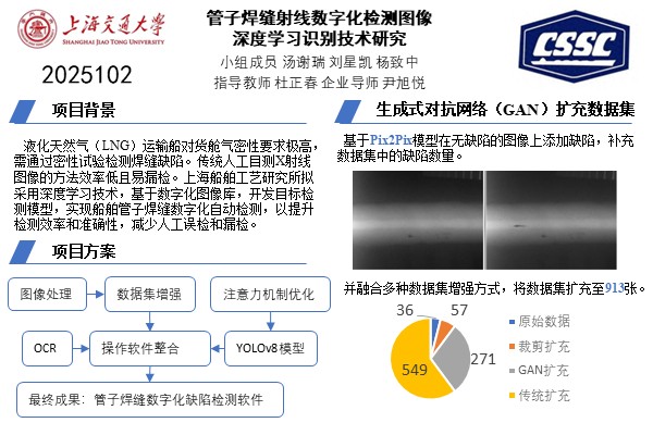 1. 完成船舶管子焊縫射線數(shù)字化檢測圖像預(yù)處理;完成基于生成對抗網(wǎng)絡(luò)的數(shù)據(jù)集增強(qiáng),實(shí)現(xiàn)在無缺陷的X射線焊縫圖像上通過pix2pix模型生成器神經(jīng)網(wǎng)絡(luò)推理添加焊縫缺陷。