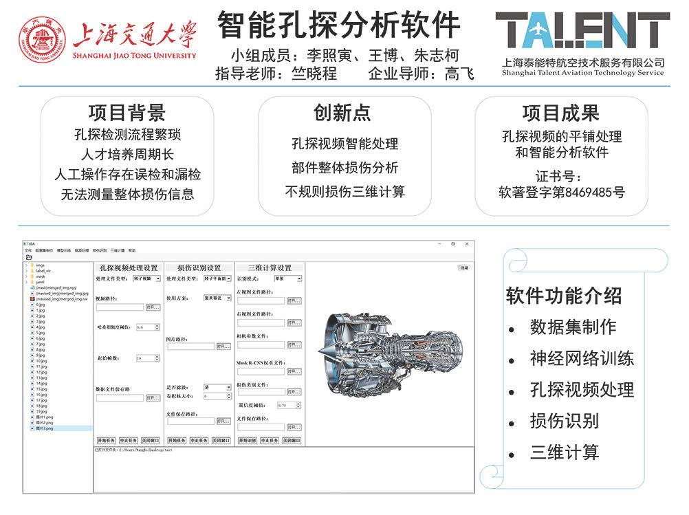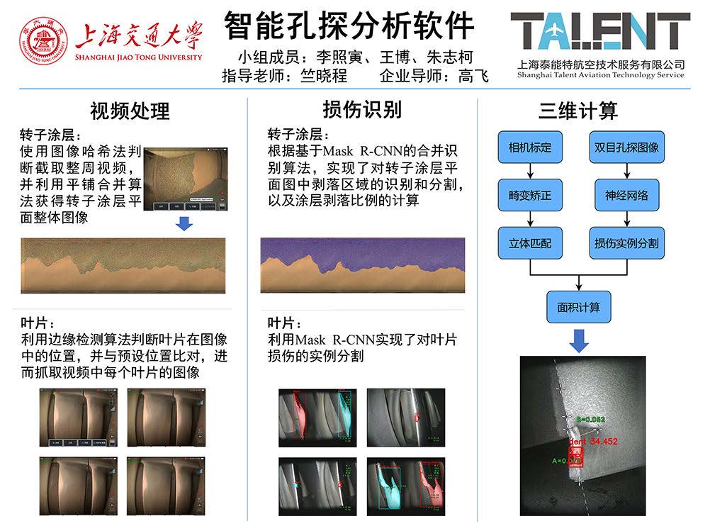 孔探檢測技術(shù)廣泛應用于航空發(fā)動機的檢修工作,對保證飛機的飛行安全具有重要意義。但現(xiàn)有的孔探設(shè)備存在諸多缺陷,對專業(yè)人員依賴性強。為此,本項目利用計算機圖像處理技術(shù)和神經(jīng)網(wǎng)絡方法實現(xiàn)對孔探圖像或視頻中損傷的自動化智能分析。項目預期開發(fā)一種智能孔探分析軟件,通過后處理方法,獲取航空發(fā)動機某一部件的整體信息。同時,利用神經(jīng)網(wǎng)絡算法實現(xiàn)對孔探圖片和視頻中損傷的進行自動識別和分類,并加入三維分析,完成對損傷的自動化定量測量。