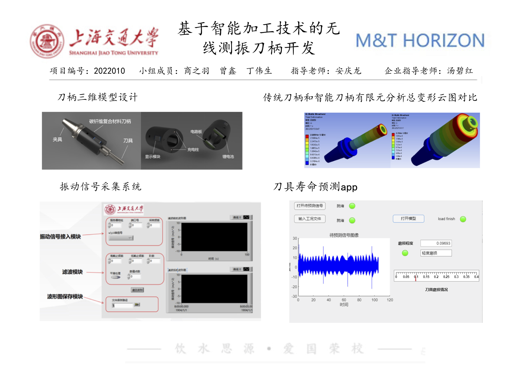 參考雄克刀柄模型基礎上,通過SOLIDWORKS完成刀柄模型建模。通過ANSYS仿真分析對市場上已有的刀柄與自行設計的刀柄進行刀具的性能評價,靜態(tài)結構仿真、模態(tài)仿真、諧響應分析等仿真給出的結果表明,本項目開發(fā)的刀柄較傳統(tǒng)刀柄的性能有很大提升。基于LABVIEW平臺,搭建振動信號采集和離線處理系統(tǒng),振動信號采集試驗表明信號采集效果良好。搭建神經(jīng)網(wǎng)絡模型對刀具的損耗進行離線分析,提取特征值并就特征值給出預測算法,并設計完成了相應的基于MATLAB的app開發(fā)。