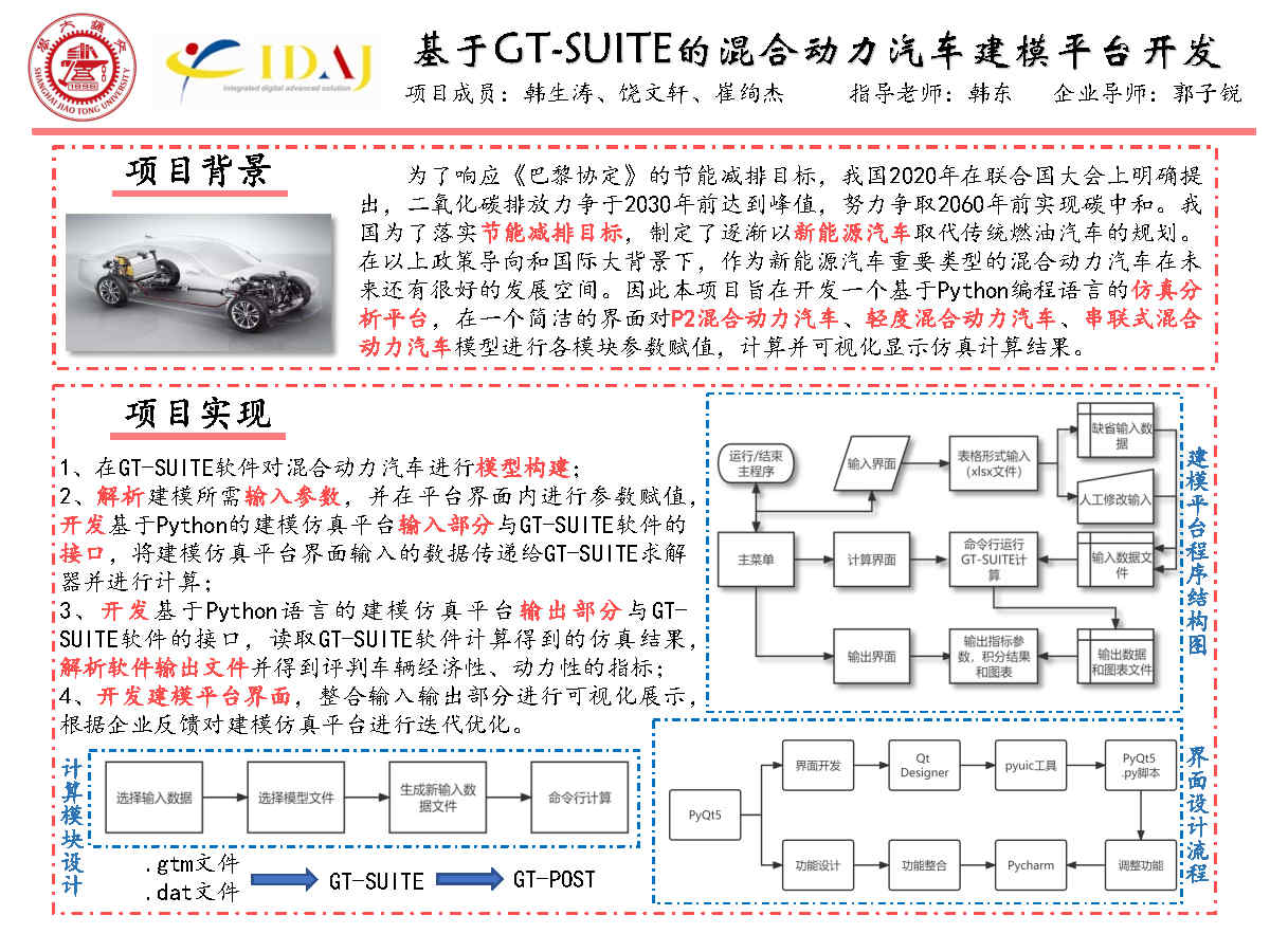 混合動(dòng)力汽車是當(dāng)前熱門的研究課題,而用于混合動(dòng)力汽車整車級(jí)建模的GT-SUITE軟件操作較復(fù)雜,學(xué)習(xí)和使用的時(shí)間成本較高。為了在汽車仿真工作中簡(jiǎn)化人工操作流程,加快開發(fā)速度,本項(xiàng)目基于GT-SUITE模型,應(yīng)用Python腳本和工具,開發(fā)了一款混合動(dòng)力汽車建模平臺(tái),可以在一個(gè)簡(jiǎn)潔的界面內(nèi)對(duì)串聯(lián)式混合動(dòng)力汽車、輕度混合動(dòng)力汽車、P2架構(gòu)混合動(dòng)力汽車模型進(jìn)行各模塊參數(shù)賦值、計(jì)算并可視化顯示仿真計(jì)算結(jié)果,實(shí)現(xiàn)了上述三類混合動(dòng)力汽車模型的自動(dòng)搭建和快速分析。
