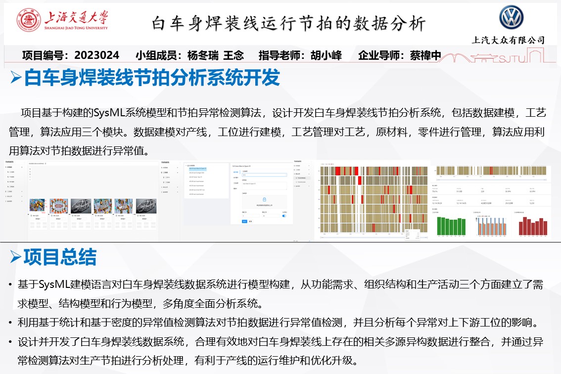 本項目通過對SysML建模方法與異常數(shù)據(jù)檢測算法的研究,設計開發(fā)白車身焊裝線數(shù)據(jù)系統(tǒng),實現(xiàn)對生產(chǎn)節(jié)拍信息的合理分析,從而支持生產(chǎn)線運行過程的管理決策。