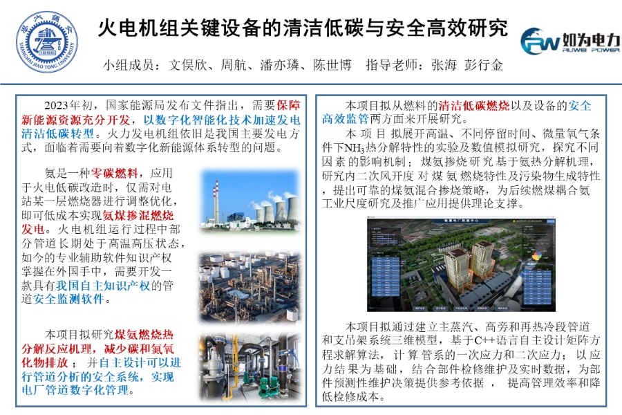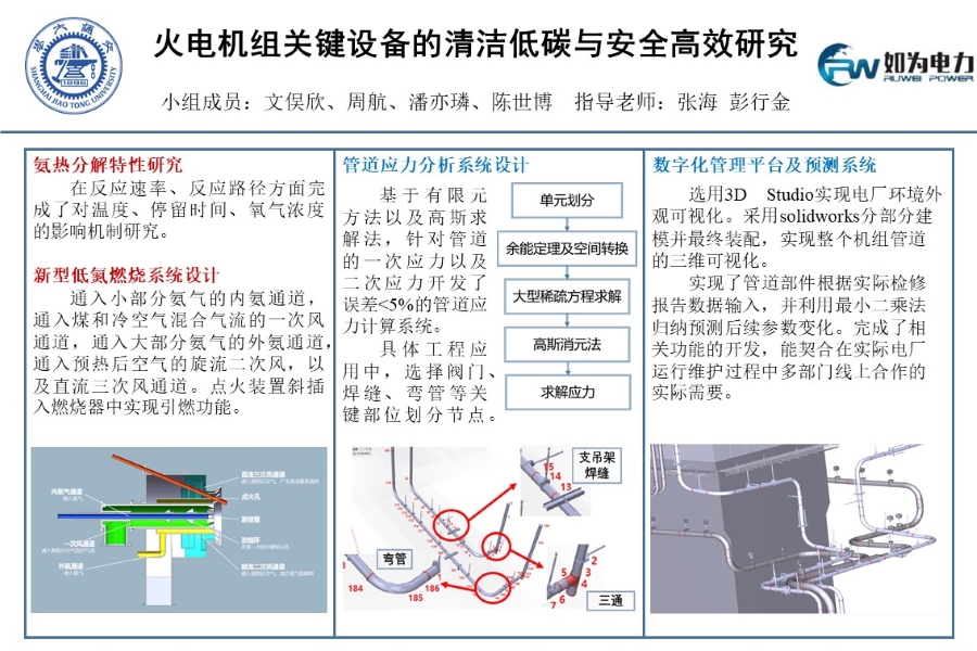 本項(xiàng)目以降低火力發(fā)電碳排放、完成發(fā)電廠數(shù)字化安全監(jiān)管為研究主題,擬通過對(duì)煤氨摻混熱分解機(jī)理進(jìn)行研究,并且根據(jù)該熱分解機(jī)理設(shè)計(jì)新型燃燒器以降低火力發(fā)電碳排放,并且為針對(duì)燃燒不穩(wěn)定以及產(chǎn)生的高溫高壓等安全隱患,進(jìn)行管道應(yīng)力安全系統(tǒng)的開發(fā)以及數(shù)字化管理系統(tǒng)的開發(fā),以達(dá)到數(shù)字化智能化管理的目標(biāo)。