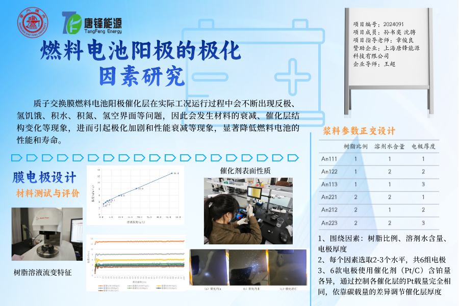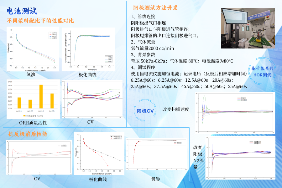 在本項目進(jìn)行過程中,項目成員通過深入分析燃料電池抗反極性能的影響因素,設(shè)計獲得6種陽極催化劑漿料。此外,成員通過對質(zhì)子膜進(jìn)行電導(dǎo)率測試和抗拉伸強(qiáng)度測試,完成質(zhì)子膜的標(biāo)定以確保膜材料的性能穩(wěn)定和可靠。通過測量漿料的接觸角,驗證各漿料在質(zhì)子交換膜上的鋪展性能。此外,項目成員完成了對應(yīng)的6種膜電極制備,并對其進(jìn)行電池性能測試,處理得到極化曲線、電化學(xué)活性面積等關(guān)鍵性能指標(biāo),進(jìn)一步研究了陽極抗反極的機(jī)理。依此,項目成員開發(fā)并優(yōu)化了陽極過電勢的測試方法,為深入了解和提升燃料電池的抗反極性能提供了重要的數(shù)據(jù)支持和理論基礎(chǔ)。