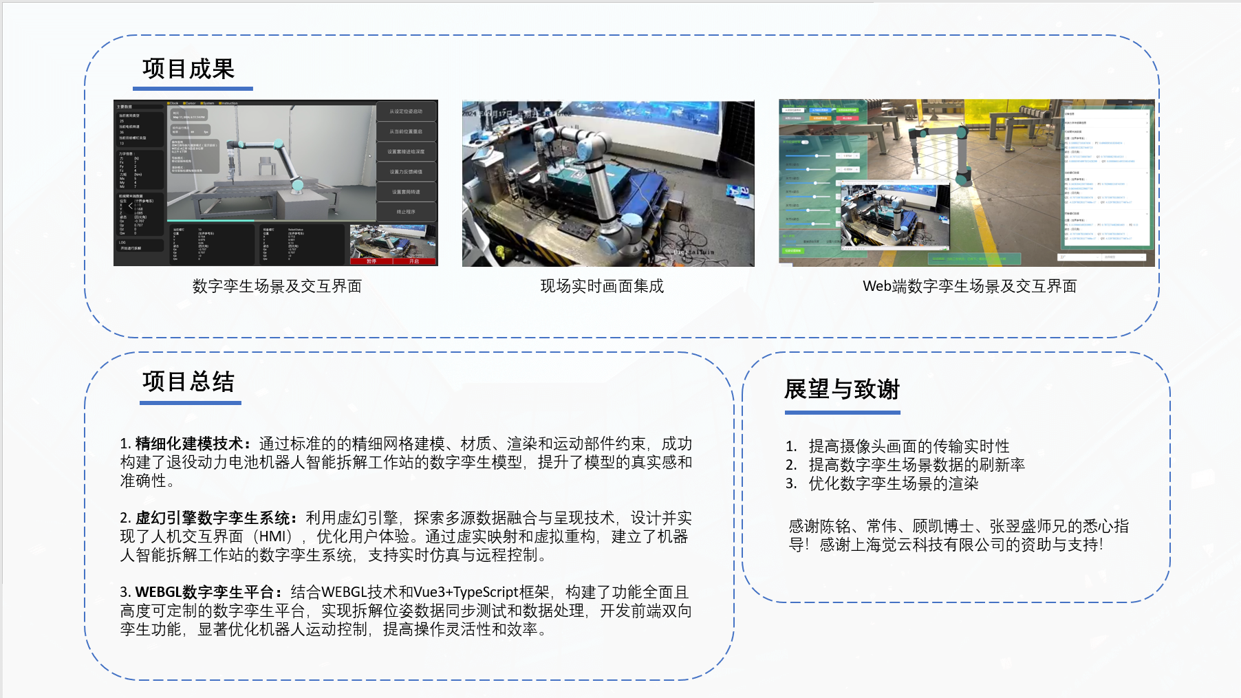 本項(xiàng)目名稱為《退役動力電池機(jī)器人智能拆解工作站的數(shù)字孿生系統(tǒng)研究》,合作單位為上海交通大學(xué)和上海覺云科技有限公司。隨著電動汽車市場的快速發(fā)展,妥善處理退役動力電池對生態(tài)環(huán)境保護(hù)和資源利用具有重要意義。項(xiàng)目通過數(shù)字孿生技術(shù),在虛幻引擎(UE)和WEB前端中實(shí)現(xiàn)機(jī)器人拆解作業(yè)的實(shí)時(shí)仿真還原、實(shí)時(shí)顯示拆解信息以及遠(yuǎn)程控制機(jī)器人,顯著提升了拆解過程的效率和穩(wěn)定性,支持新能源汽車產(chǎn)業(yè)的可持續(xù)發(fā)展。