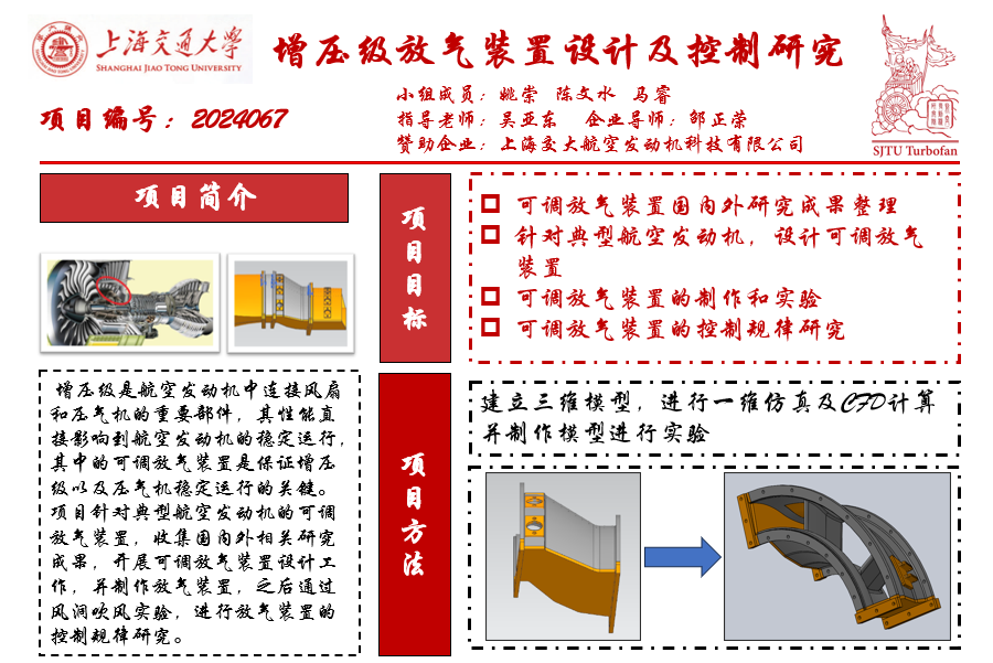增壓級(jí)是民用航空發(fā)動(dòng)機(jī)中連接風(fēng)扇和壓氣機(jī)的重要部件,其性能直接影響到航空發(fā)動(dòng)機(jī)的穩(wěn)定運(yùn)行,其中的可調(diào)放氣裝置是解決失速或者喘振現(xiàn)象的重要裝置,是保證增壓級(jí)以及壓氣機(jī)穩(wěn)定運(yùn)行的關(guān)鍵。本項(xiàng)目從模型設(shè)計(jì)、CFD流場(chǎng)分析、控制規(guī)律研究三個(gè)方面,針對(duì)典型航空發(fā)動(dòng)機(jī)的可調(diào)放氣裝置,收集了國(guó)內(nèi)外的相關(guān)研究成果,開展增壓級(jí)可調(diào)放氣裝置設(shè)計(jì)工作,并制作可調(diào)放氣裝置,以及通過(guò)風(fēng)洞吹風(fēng)實(shí)驗(yàn)收集相關(guān)實(shí)驗(yàn)數(shù)據(jù),進(jìn)行放氣裝置的控制規(guī)律研究工作。