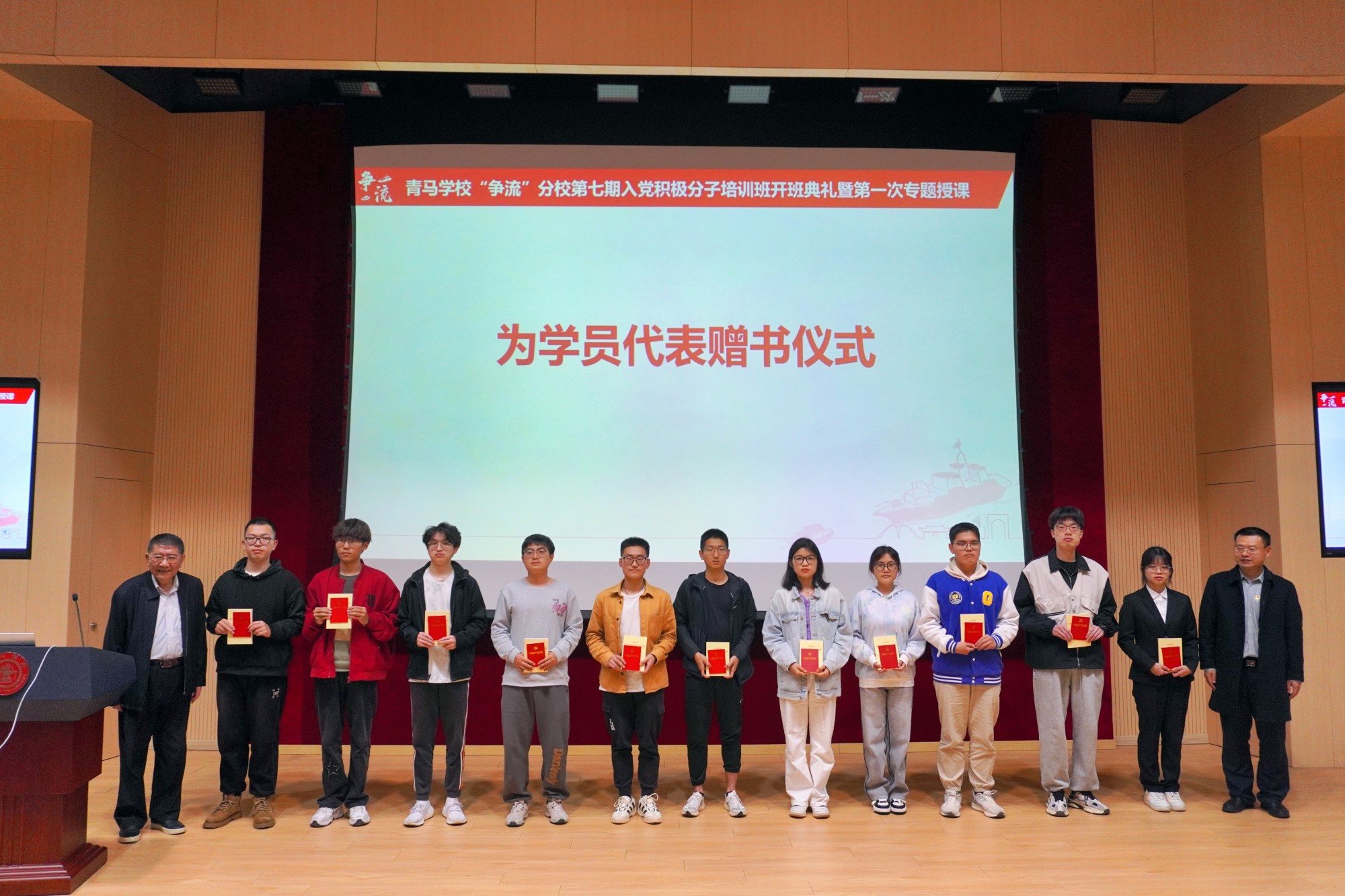 會(huì)上舉行了授旗和贈(zèng)書(shū)儀式。培訓(xùn)班副班主任李哲介紹了本期培訓(xùn)班總體安排,期望培訓(xùn)班學(xué)員抓住學(xué)習(xí)機(jī)會(huì),通過(guò)專題授課、網(wǎng)絡(luò)黨校、實(shí)踐教學(xué)、志愿服務(wù)等形式,提升政治理論素養(yǎng),堅(jiān)持學(xué)思用貫通、知信行統(tǒng)一。