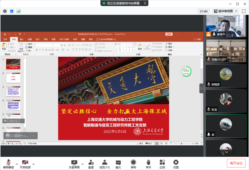 5月6日,智能制造與信息工程研究所教工黨支部召開“堅(jiān)定必勝信心 全力打贏大上海保衛(wèi)戰(zhàn)”主題黨日活動(dòng),學(xué)習(xí)貫徹習(xí)近平總書記在中央政治局常委會(huì)會(huì)議上的重要講話精神,支部全體黨員參加了活動(dòng)。