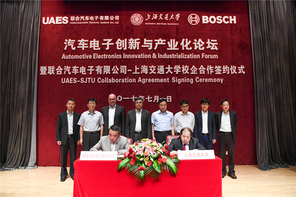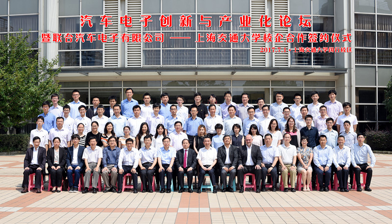 2017年7月1日,上海交通大學與聯(lián)合汽車電子有限公司聯(lián)合舉辦“汽車電子創(chuàng)新與產(chǎn)業(yè)化論壇”,并開展校企合作簽約。聯(lián)合汽車電子有限公司總經(jīng)理熊偉銘、副總經(jīng)理郭曉潞、技術中心總監(jiān) Dr. Wabro、人力資源部總監(jiān)任剛、副總工程師盧萬成,上海交通大學校長、黨委副書記、中國工程院院士林忠欽,校長助理奚立峰,機械與動力工程學院黨委書記兼院長杜朝輝、常務副院長彭志科,電子信息與電氣工程學院、材料科學與工程學院、發(fā)展聯(lián)絡處等學院部門師生近兩百人參加了活動。