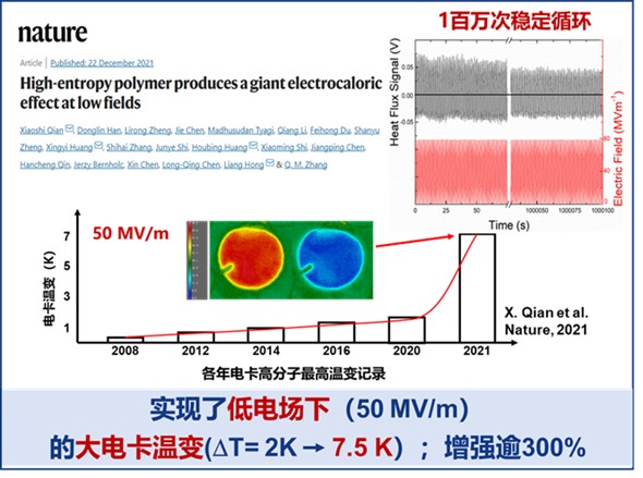 巨電卡效應(yīng)是一種奇異的凝聚態(tài)物理現(xiàn)象,利用電介質(zhì)充放電過(guò)程中的可逆電致溫變組成制冷循環(huán),逆著溫度梯度輸運(yùn)熱量。電卡制冷系統(tǒng)使用固態(tài)電介質(zhì)作為制冷材料,功耗小、能效高,具有零溫室效應(yīng)潛能(GWP)、易于小型化/輕量化等特點(diǎn),是熱管理領(lǐng)域重要的顛覆性前瞻技術(shù)之一。項(xiàng)目在國(guó)際上首次提出了極化高熵材料設(shè)計(jì)方法,制備了一種極化高熵高分子,顯著增強(qiáng)了其低電場(chǎng)下的電卡制冷能力(近400%),制冷材料循環(huán)壽命提升超過(guò)20000倍,首次了實(shí)現(xiàn)百萬(wàn)次無(wú)損循環(huán),突破了制約領(lǐng)域發(fā)展的一項(xiàng)關(guān)鍵瓶頸。相關(guān)研究工作近兩年發(fā)表于Nature、Science等高水平學(xué)術(shù)刊物。
