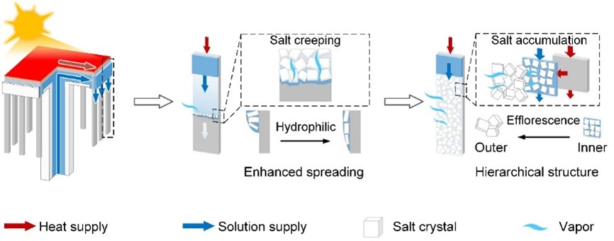 針對太陽能界面蒸發(fā)技術(shù)處理鹽水時面臨的鹽晶體沉積阻礙蒸發(fā)的瓶頸問題,團(tuán)隊(duì)通過利用鹽晶體爬行和風(fēng)化過程,并對鹽結(jié)晶過程進(jìn)行調(diào)控,使得鹽晶體自組裝成為有利于蒸發(fā)過程的分層多孔蒸發(fā)器,將鹽結(jié)晶從傳統(tǒng)認(rèn)為的蒸發(fā)抑制因素轉(zhuǎn)變?yōu)榇龠M(jìn)因素。研究構(gòu)建的分層多孔鹽晶體蒸發(fā)器能夠?qū)崿F(xiàn)被動溶液輸運(yùn)、快速蒸汽擴(kuò)散和穩(wěn)定熱量輸運(yùn),在處理27.3 wt%鹽度的濃縮海水時實(shí)現(xiàn)了18.78 kg m-2 h-1的蒸發(fā)速率和鹽-水完全分離的零排放處理效果,理論鹽產(chǎn)率相較以往研究高出一倍以上,并實(shí)現(xiàn)了濃縮海水在10天測試周期內(nèi)的連續(xù)穩(wěn)定蒸發(fā)結(jié)晶。