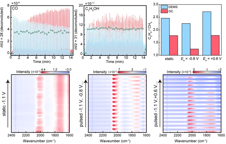 電催化CO2還原反應(yīng)的動(dòng)力學(xué)和產(chǎn)物分布在很大程度上取決于陰極局部反應(yīng)微環(huán)境,包括電極-電解液界面上的中間體演化,以及擴(kuò)散層內(nèi)的物質(zhì)傳輸。脈沖CO2電解與固定電位下的靜態(tài)電解相比,可同時(shí)調(diào)節(jié)陰極側(cè)的電勢(shì)極化和濃度極化,有效抑制析氫且提升目標(biāo)產(chǎn)物的選擇性,但其促進(jìn)機(jī)制仍多有爭(zhēng)議。對(duì)此,蔣昆團(tuán)隊(duì)發(fā)展了高時(shí)間分辨的在線電化學(xué)差分質(zhì)譜DEMS、原位衰減全反射表面增強(qiáng)紅外吸收光譜ATR-SEIRAS測(cè)量方法,并結(jié)合多物理場(chǎng)仿真,系統(tǒng)研究了Ag、SnO2和Cu電極上CO2脈沖電解的深層機(jī)制。