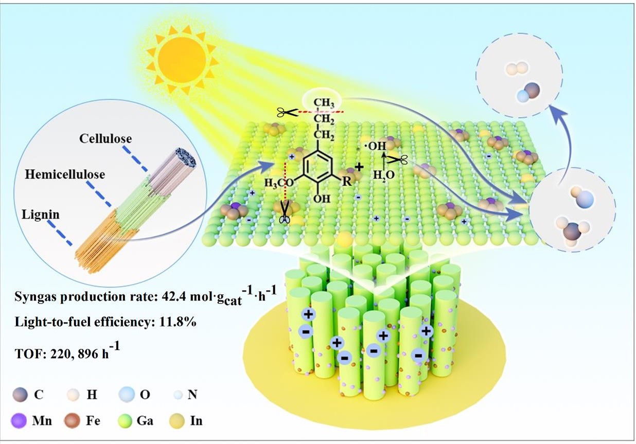 圖1. InGaN納米線/Si組裝體擔(dān)載Fe-Mn二元非貴金屬活化木質(zhì)素C-C和C-O鍵制合成氣示意圖