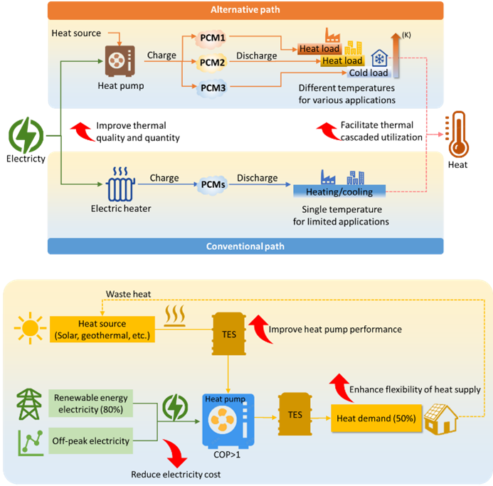 將熱泵與帶有相變材料(PCM)的潛熱儲(chǔ)熱裝置相結(jié)合,構(gòu)建熱泵-相變儲(chǔ)熱熱力循環(huán)系統(tǒng),可實(shí)現(xiàn)熱能增量提質(zhì)、靈活調(diào)控、梯級(jí)利用,這一技術(shù)的突破將為全球能源系統(tǒng)的優(yōu)化提供新的解決方案。耦合系統(tǒng)通過將電能轉(zhuǎn)化為熱能,在低谷電價(jià)時(shí)存儲(chǔ)、用電高峰時(shí)釋放,靈活匹配用戶熱負(fù)荷供需、降低電費(fèi)成本、提高電網(wǎng)安全性。另一方面,由于不同用戶的熱利用需求存在低溫、中溫、高溫的差異,熱泵根據(jù)需求調(diào)節(jié)輸出溫度,與相變材料相結(jié)合,確保不同溫度需求的高效匹配。然而,兩者之間如何實(shí)現(xiàn)匹配這一主要難點(diǎn)亟需通過新技術(shù)的突破來(lái)克服。