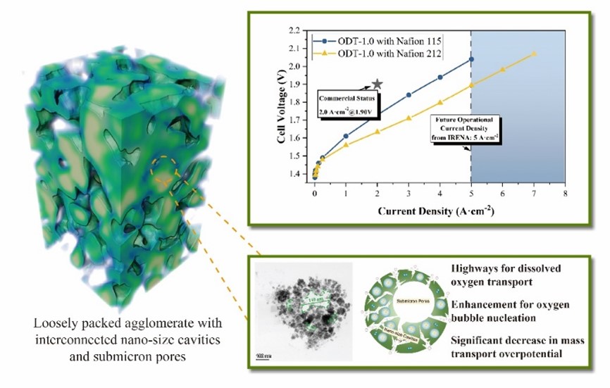 作為一種具有動(dòng)態(tài)特性好、產(chǎn)氫純度高和穩(wěn)定性強(qiáng)的電化學(xué)制氫技術(shù),PEM電解水制氫技術(shù)被廣泛應(yīng)用。然而較高電解制氫電流密度下,由低效的氧氣氣泡傳輸造成的陽(yáng)極催化層內(nèi)的高傳質(zhì)損失,一直是制約PEM電解水制氫性能進(jìn)一步提升的原因。針對(duì)上述問(wèn)題,研究團(tuán)隊(duì)利用多尺度的表征技術(shù)和數(shù)學(xué)模型計(jì)算指出,離聚物緊密包裹IrOx催化劑形成的致密團(tuán)聚體是造成陽(yáng)極催化層內(nèi)高傳輸損失的根本原因,進(jìn)而針對(duì)性的進(jìn)行團(tuán)聚體調(diào)控,實(shí)現(xiàn)高效的陽(yáng)極催化層內(nèi)的氧氣氣泡管理。