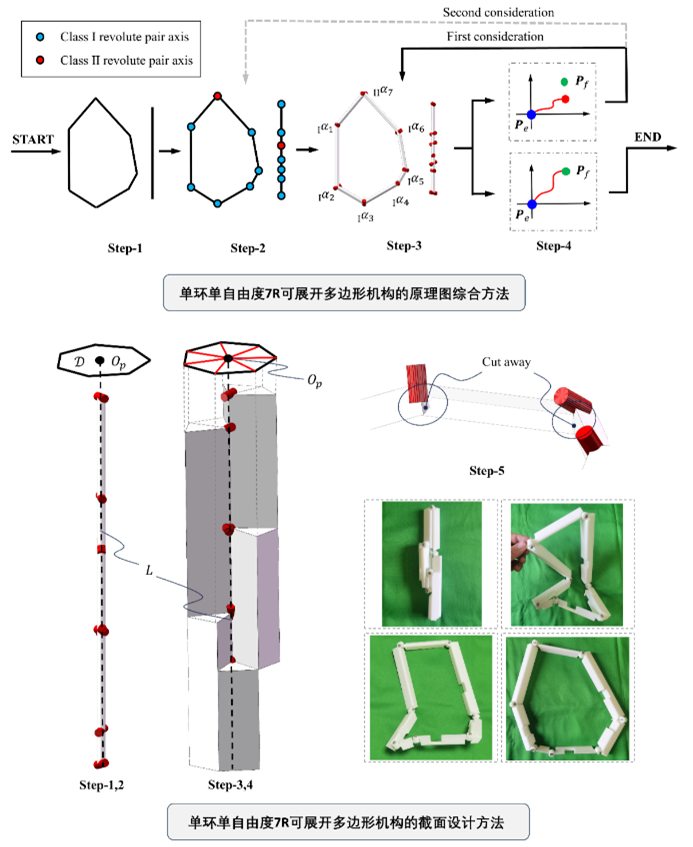 近日,機(jī)械與動力工程學(xué)院重大裝備設(shè)計(jì)與控制工程研究所郭為忠教授團(tuán)隊(duì)在國際機(jī)構(gòu)學(xué)期刊Mechanism and Machine Theory上發(fā)表了題為“Synthesis and cross-section design of a new family of single-loop 7R deployable polygon mechanisms”的研究論文。該團(tuán)隊(duì)首次提出了單環(huán)7R可展開多邊形機(jī)構(gòu),建立了系統(tǒng)的設(shè)計(jì)方法,為具有一般展開輪廓和網(wǎng)絡(luò)劃分的大型可動結(jié)構(gòu)設(shè)計(jì)提供了可能,為航空航天、機(jī)械超材料、藝術(shù)建筑等領(lǐng)域的復(fù)雜展開功能與空間優(yōu)化提供了新技術(shù)途徑。重大裝備設(shè)計(jì)與控制工程研究所2022級致遠(yuǎn)榮譽(yù)計(jì)劃博士研究生陳昊為論文第一作者,郭為忠教授為通訊作者。