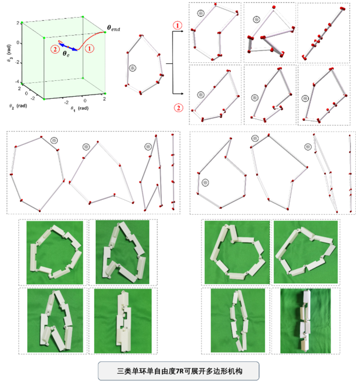 針對獲得理論機(jī)構(gòu)解的原理圖綜合子問題,研究團(tuán)隊(duì)討論了構(gòu)建DGM過程中的兩類轉(zhuǎn)動副軸線布局及其取值范圍,并定義了構(gòu)建DGM的三類參數(shù)。為了設(shè)計(jì)出具有任意期望的可展開多邊形形態(tài)的單環(huán)單自由度DGM,該團(tuán)隊(duì)首次提出利用DGM的不同狀態(tài)完成不同種類參數(shù)的設(shè)計(jì),給出了每類參數(shù)設(shè)計(jì)過程中所需要的全部約束條件及其幾何含義,并使用預(yù)測校正方法實(shí)現(xiàn)了在隱式定義的構(gòu)型空間中的路徑搜索問題,從而形成能夠設(shè)計(jì)所有單環(huán)單自由度7R DGM的原理圖綜合方法。團(tuán)隊(duì)提出的利用DGM不同狀態(tài)完成不同種類參數(shù)設(shè)計(jì)的設(shè)想,能夠拓展至其他類型DGM的原理圖設(shè)計(jì)。