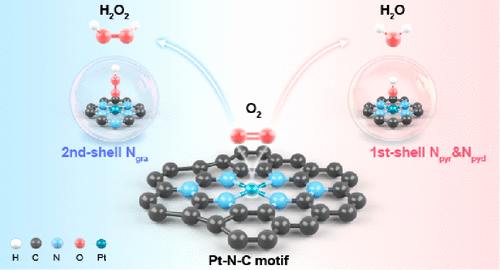 本工作中,作者制備了兩種碳納米管負(fù)載的Pt-N-C單原子催化劑用于ORR,在0.3 VRHE 電位下,實現(xiàn)了H2O2產(chǎn)物選擇性從10%至85%的調(diào)節(jié)。結(jié)合電催化周轉(zhuǎn)頻率TOF測定,以及軟/硬線X射線吸收譜XAFS、核殼分離納米粒子增強拉曼光譜SHINERS、DFT理論計算分析,證明了Pt-N-C結(jié)構(gòu)中第一殼層的吡啶-N和吡咯-N配位有利于O2轉(zhuǎn)化為H2O,而引入第二層石墨-N摻雜可以微調(diào)Pt中心位點的電子結(jié)構(gòu),導(dǎo)致*OOH的結(jié)合強度減弱,從而主導(dǎo)了O2轉(zhuǎn)化為H2O2過程。該工作揭示了單原子位點附近微觀結(jié)構(gòu)和性能間的構(gòu)效關(guān)系,為高選擇性和高穩(wěn)定性單原子類催化劑設(shè)計提供了研究基礎(chǔ)。