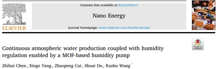 近日,機械與動力工程學(xué)院制冷與低溫工程研究所王如竹教授領(lǐng)銜的ITEWA團隊在Nano Energy上發(fā)表題為“Continuous atmospheric water production coupled with humidity regulation enabled by a MOF-based humidity pump”的研究論文,提出了一種基于MOF材料的吸附式濕泵,實現(xiàn)了連續(xù)式空氣取水與濕度調(diào)節(jié)功能耦合,裝置取水量高達(dá)2510 mLwater·kg-1MOF·day-1,同時充分挖掘MOF在大氣水吸附過程中的除濕潛力,為下一代裝置設(shè)計提供了新思路。制冷與低溫工程研究所博士生陳芷薈為論文第一作者,王如竹教授為通訊作者。