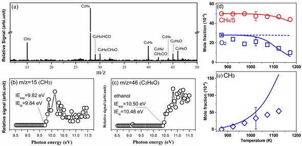 圖2 (a)光電離質(zhì)譜;(b)甲基自由基與乙醇的光電離效率譜;(c)反應(yīng)物甲烷與氧氣的實(shí)驗(yàn)與模擬結(jié)果對(duì)比;(d)甲基自由基的實(shí)驗(yàn)與模擬結(jié)果對(duì)比