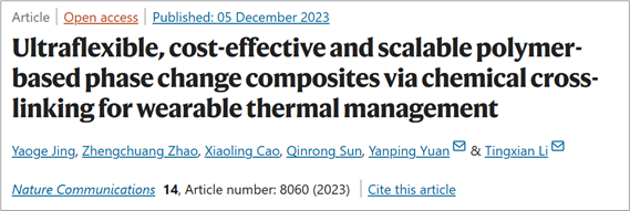 近日,上海交大機械與動力工程學(xué)院ITEWA團隊在國際期刊Nature Communications上發(fā)表了題為“Ultraflexible, cost-effective and scalable polymer-based phase change composites via chemical cross-linking for wearable thermal management”的研究論文。該論文由制冷與低溫工程研究所ITEWA團隊與西南交通大學(xué)團隊合作完成,為規(guī)模化制備柔性定形相變儲熱復(fù)合材料和可穿戴的熱管理器件提供了新思路。制冷與低溫工程研究所博士后趙正創(chuàng)和西南交通大學(xué)碩士研究生敬瑤閣為論文共同第一作者,李廷賢研究員和西南交通大學(xué)袁艷平教授為共同通訊作者,王如竹教授對該工作給予了指導(dǎo)和建議。