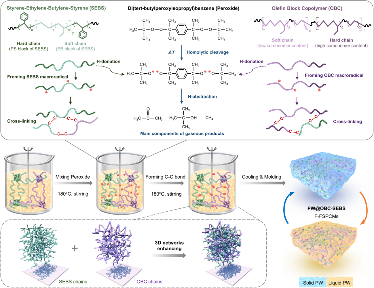 研究人員成功制備了超柔性定形相變儲熱復(fù)合材料PW@OBC-SEBS,將相變材料PW嵌入C-C鍵強化的SEBS-OBC雙聚合物網(wǎng)絡(luò)結(jié)構(gòu),實現(xiàn)了相變材料的定形封裝,可以在加熱-冷卻循環(huán)條件下維持良好的熱穩(wěn)定性和柔性特征。通過化學(xué)反應(yīng)路徑分析和實驗測試,研究發(fā)現(xiàn)該化學(xué)交聯(lián)方法合成的儲熱復(fù)合材料相對傳統(tǒng)物理混合技術(shù)制備的復(fù)合材料,展現(xiàn)出顯著的聚合物化學(xué)交聯(lián)增韌效應(yīng)和熱穩(wěn)定性,斷裂伸長率達560%。該材料經(jīng)過500次循環(huán)試驗后仍保持穩(wěn)定的柔性功能,且在高于相變溫度的熱空氣和熱水環(huán)境下具有穩(wěn)定的定形效果而不出現(xiàn)液體泄漏,相變焓值高達176 kJ/kg,具有優(yōu)異的儲熱能力。