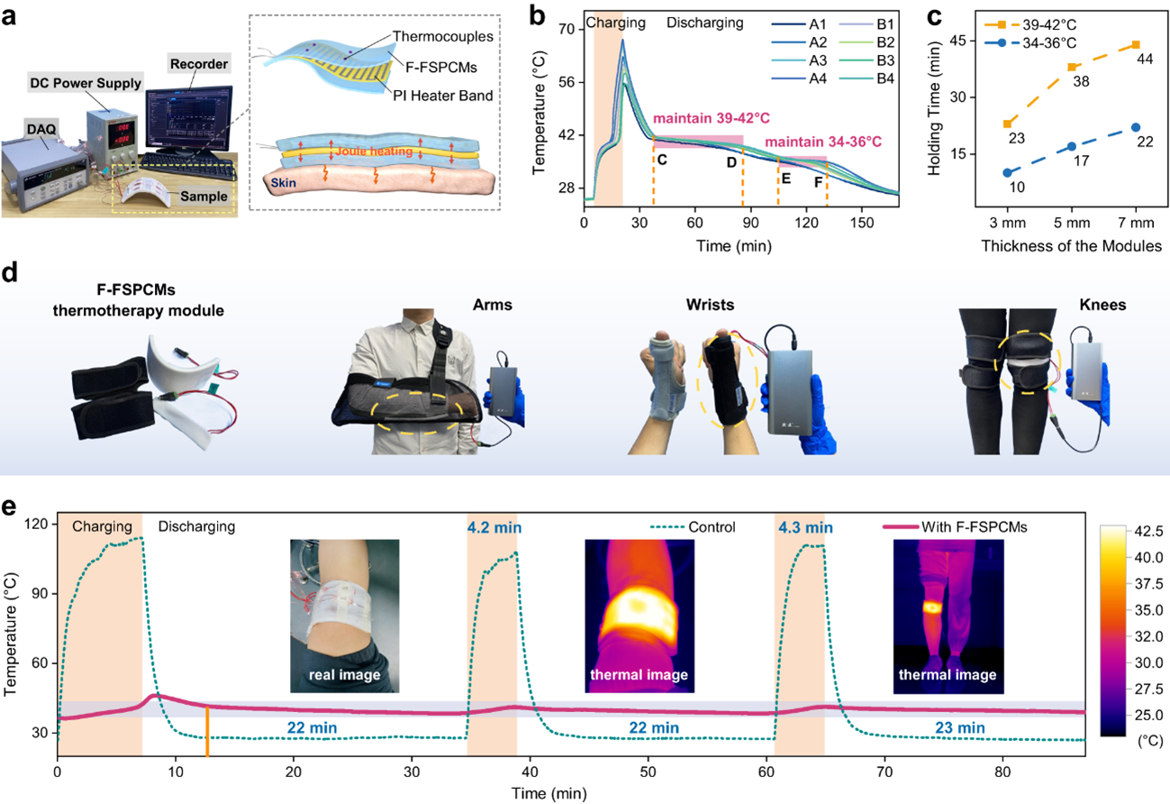 研究人員揭示了過氧化物分解自由基驅(qū)動聚合物C-C鍵生成強化的化學(xué)交聯(lián)網(wǎng)絡(luò)是實現(xiàn)儲能材料優(yōu)異熱性能和力學(xué)性能的根本原因,提出了可規(guī)模化制備柔性定形相變儲熱復(fù)合材料的新方法,實驗室單次制備質(zhì)量可達20 kg。研究人員進而設(shè)計構(gòu)建了可用于人體熱舒適性調(diào)節(jié)的可穿戴便攜式相變儲能熱管理器件,表現(xiàn)出了長效穩(wěn)定的儲熱和溫度調(diào)控能力,實現(xiàn)了人體熱療39~42 °C熱舒適溫區(qū)的可穿戴熱管理。