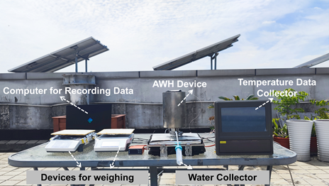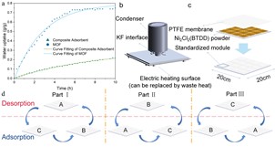 針對該材料特性合作團隊開發(fā)了可適應規(guī)模化應用的封裝方案并設計了全新的運行策略。不同于常規(guī)單吸附模塊的設計,該策略中使用了多吸附模塊以實現(xiàn)裝置的準連續(xù)運行,而吸附模塊數(shù)量經(jīng)過了吸附動力學與脫附動力學的匹配,類似“輪盤”的運行策略可以同時保證裝置的連續(xù)運行以及吸附劑模塊的充分吸附。在該研究中,基于此設計思路及擬合結(jié)果,研究人員最終采用了三塊相同的吸附模塊進行策略演示并據(jù)此設計了可突破日夜限制的低溫位熱能驅(qū)動的空氣取水裝置。