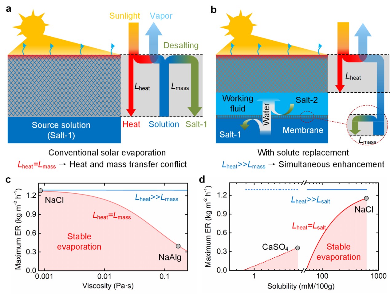 為解決上述問題,研究提出了耦合太陽能蒸發(fā)傳熱、毛細(xì)流動和鹽分傳輸?shù)睦碚撃P停C明了溶液物性對太陽能蒸發(fā)速率的限制效應(yīng),指出高溶液粘度和低溶解度會分別在短周期和長周期運行中導(dǎo)致太陽能蒸發(fā)的失效。研究進(jìn)一步提出了耦合太陽能蒸發(fā)與正滲透的溶質(zhì)置換策略,實現(xiàn)了CaSO4溶液的不結(jié)垢蒸發(fā),并在處理粘度比水高225倍的NaAlg溶液時將蒸發(fā)性能提升了478%。