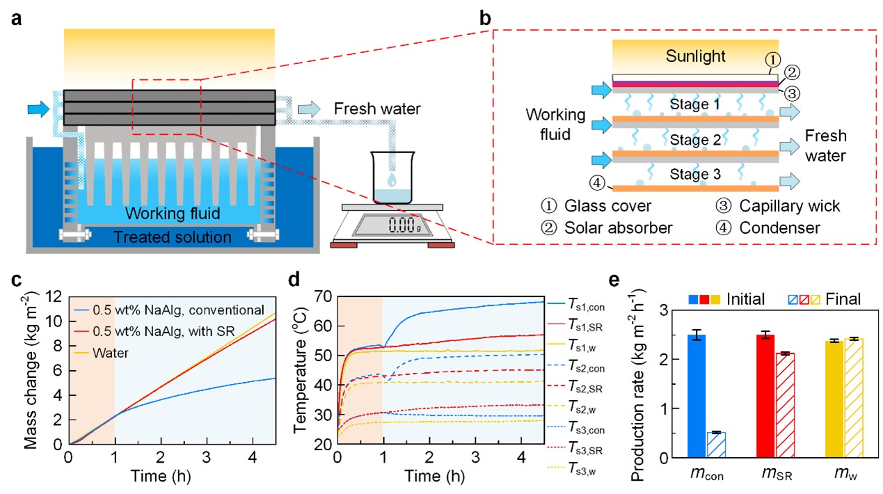 太陽能蒸發(fā)是實現(xiàn)分布式、可持續(xù)海水淡化或水處理的關(guān)鍵手段,特別是采用多孔蒸發(fā)器的界面局部加熱型太陽能蒸發(fā),實現(xiàn)了蒸發(fā)效率和速率的顯著提升。目前,很多研究使用純NaCl水溶液進(jìn)行測試,然而在實際脫鹽或廢水處理場景中,被蒸發(fā)的溶液各有不同,例如海水中會存在容易導(dǎo)致結(jié)垢的低溶解度成分,而廢水中會存在有機(jī)分子而導(dǎo)致溶液粘度上升,這些都有可能導(dǎo)致現(xiàn)有太陽能蒸發(fā)設(shè)計的失效,但太陽能蒸發(fā)在應(yīng)對不同溶液的失效機(jī)理與解決方法仍然鮮有研究,這限制了太陽能蒸發(fā)的廣泛與實際應(yīng)用。