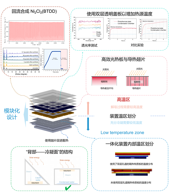由于工業(yè)化的進(jìn)程與全球性的氣候變化,目前全球仍有超過(guò)四十億人面臨著嚴(yán)峻的飲水危機(jī)。另一方面,大氣中蘊(yùn)藏著極為豐富的水蒸氣,水含量大約相當(dāng)于地球表面河流總量的6倍,如何大量且高效地提取出空氣中的水蒸氣,并將其以液態(tài)水的方式收集成為一個(gè)前沿問(wèn)題。基于吸附式空氣取水技術(shù)借助吸附劑實(shí)現(xiàn)低濕度下的水蒸氣吸附以及低品位熱源(如太陽(yáng)能)的脫附,最終可以實(shí)現(xiàn)將大氣中豐富的水蒸氣轉(zhuǎn)化為可直接飲用的液態(tài)水。雖然目前已有的研究初步展現(xiàn)了空氣取水技術(shù)的可行性,但是研究中使用了較多電力驅(qū)動(dòng)的輔助裝置以增強(qiáng)系統(tǒng)表現(xiàn),這在一定程度上忽視了以沙漠為代表的離網(wǎng)使用場(chǎng)景的實(shí)際使用條件。另一方面,高性能MOF吸附劑的擴(kuò)大化合成也是這一技術(shù)擴(kuò)展的一個(gè)重要障礙。研究基于吸附式空氣取水技術(shù),形成了一整套“材料-器件-裝置”的綜合技術(shù)方案,提出了擴(kuò)大化低成本合成高性能MOF吸附劑Ni2Cl2(BTDD)的技術(shù)方案以及與之配套的模塊化緊湊式太陽(yáng)能空氣取水機(jī)組。