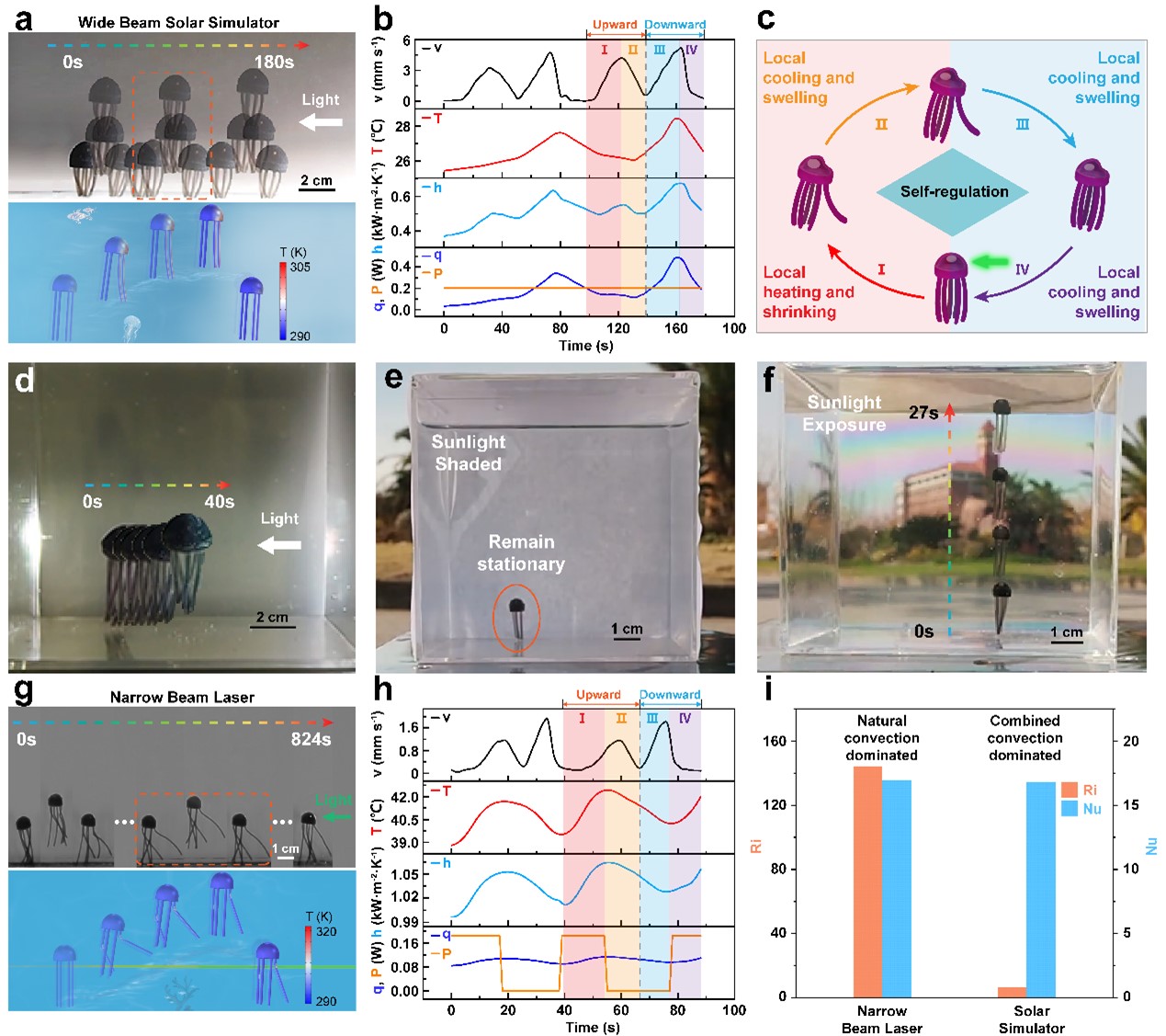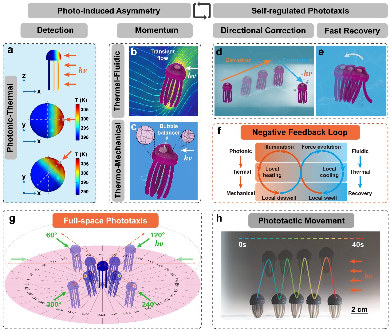 在光照條件下,PTV利用定向光子能量引發(fā)溫度、流場和幾何形態(tài)上的非對稱性。光子誘導(dǎo)的多場可逆非對稱性使PTV能夠?qū)θ魏稳肷浞较蜃龀鲰憫?yīng)(圖1a),從而產(chǎn)生可提供動力的向光流體運動(圖1b),并自發(fā)地采取最佳姿態(tài)進行低阻力的向光游動(圖1c)。為了避免因受熱表面引起的上升流而產(chǎn)生的偏移運動,PTV能夠自適應(yīng)地增強受熱表面的對流換熱,從而為糾正方向偏差提供負反饋(圖1d)。此智能系統(tǒng)采用一種快速驅(qū)動和恢復(fù)的刺激響應(yīng)水凝膠為基質(zhì)材料,對來自不同方向的光照能做出快速響應(yīng)(圖1e)。高靈敏度和可逆的化學(xué)機械反應(yīng)使其能夠在溫和的光照條件下(<1 Sun),實現(xiàn)對全空間的向光性和精準操縱(見圖1g、h)。